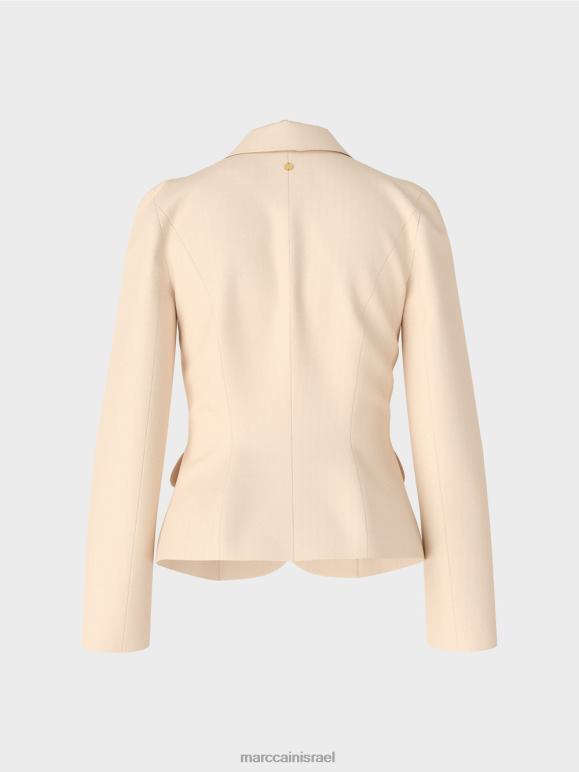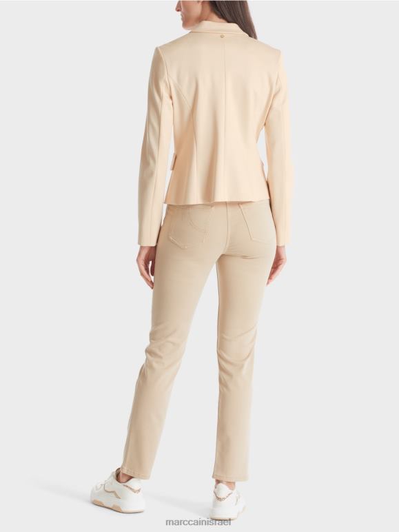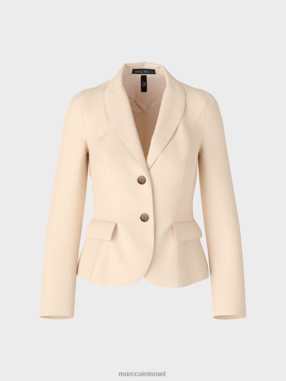 בלייזר בגזרה נשית העשוי מתערובת ויסקוזה רכה עם אלסטן. הצורה המחבקת לגוף נוצרת על ידי תפרי נסיכות בחלקים הקדמיים והאחוריים. סופר אלגנטי: הדש הצר דמוי צווארון צעיף. הפרטים המעטרים הם הדשים הדקורטיביים והכפתורים הצבעוניים המנוגדים. אזור הכתפיים והשרוולים מרופדים להלבשה והורדה קלה יותר.