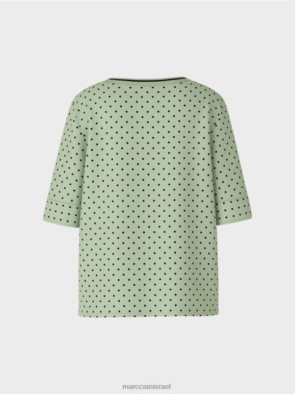 שילוב של פרטים נשיים וספורטיביים. הכפפות העדינות על קצות השרוול מנוגדות לגזרה הספורטיבית על קו הצוואר. הקצה הוא בסריג מצולע בתערובת ויסקוזה. הבד מעניק לחלק העליון בסגנון החולצה המנוקד הזה את קווי המתאר הרכים שלו.