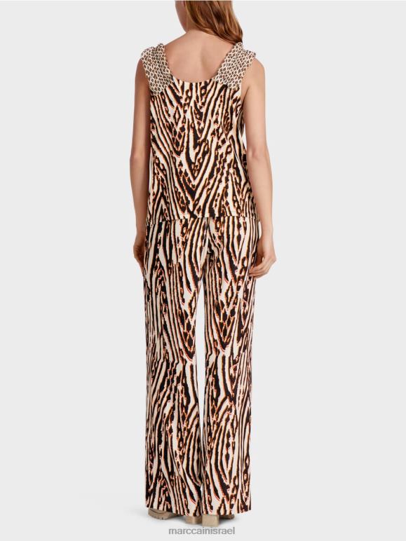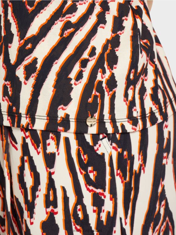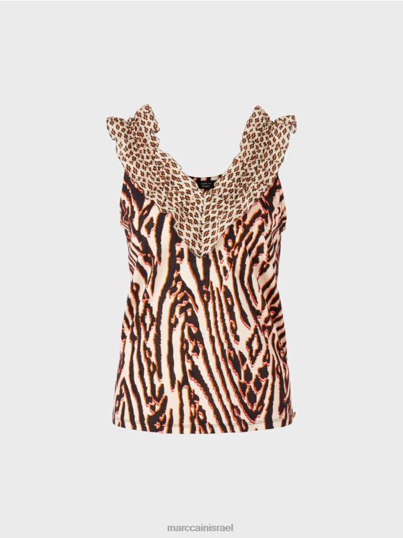 הבנייה האלגנטית והדוגמאות המעורבות הופכות את טופ הכותנה הקצר הזה לפריט אמירה. מוקד העיצוב הוא הצווארון מבד כותנה אוורירי שמרופט מבפנים ומבחוץ. הוא בצורת V מלפנים ודמוי רצועה מאחור.