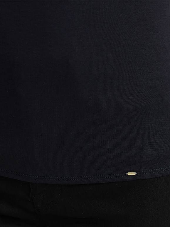 חלק עליון בגזרה ישרה בתערובת כותנה נעימה. האלגנטיות הנצחית של החלק העליון מודגשת על ידי הצוואר הרחב וחלקי הכתפיים החופפים כלאחר יד. נוחות מעולה מובטחת כאן גם בגלל תכולת האלסטן.