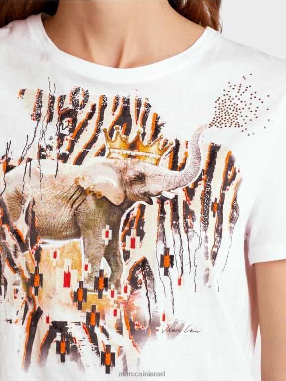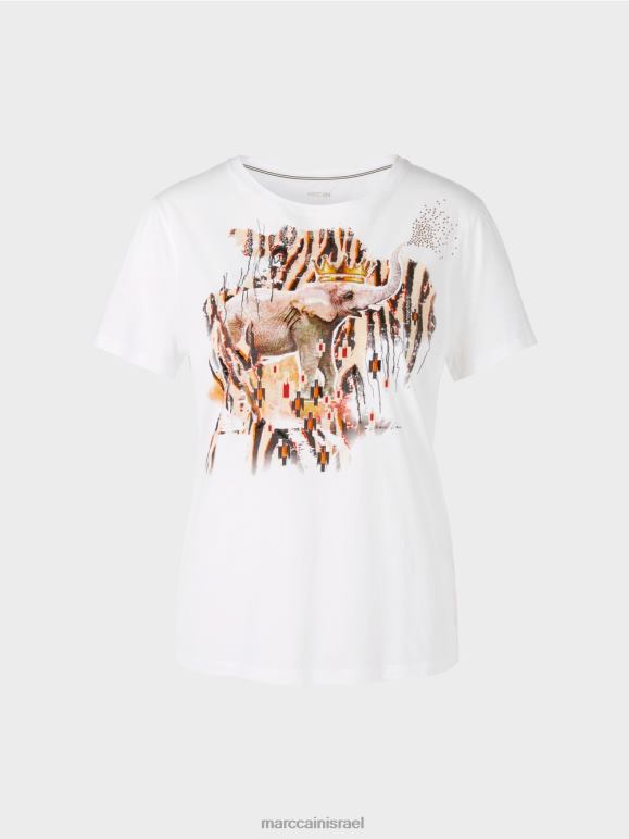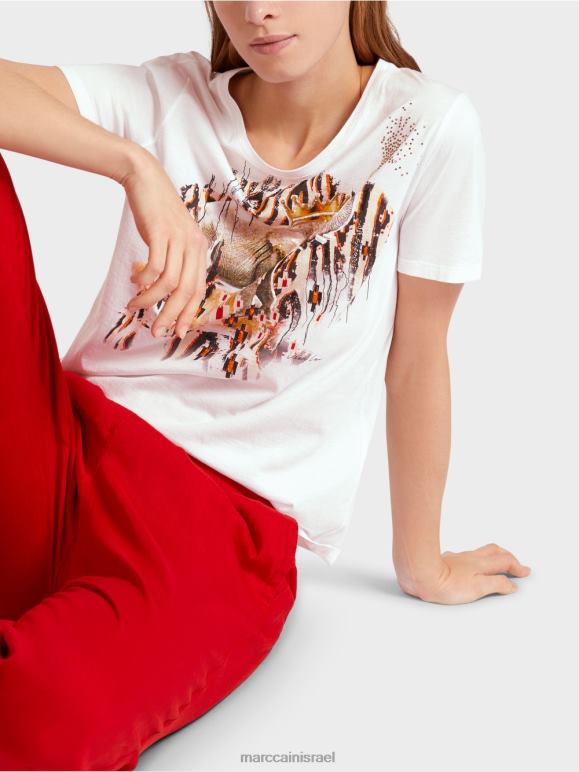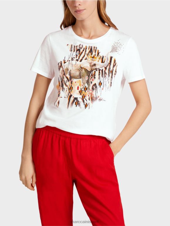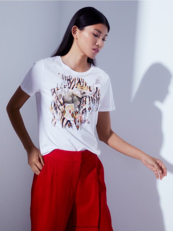 חולצת טריקו זו עשויה מכותנה קלה במיוחד. הוא בגזרה קלאסית ויש לו מוטיב בחזית בעיצוב קולאז'. המוטיב הוא שילוב של פאונה טרופית המשולבת בצורות איקאט מפוזרות. אבני החן והפאייטים באפליקציה מוסיפים פרטים מושכי עין.