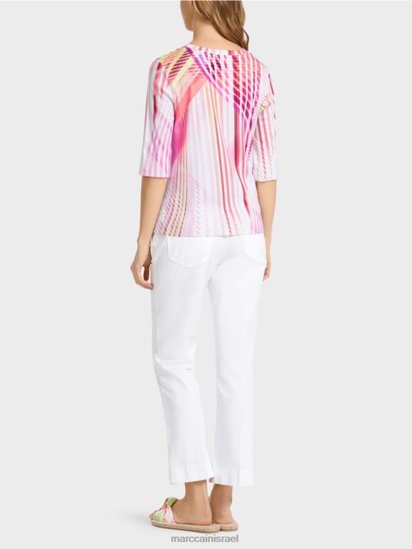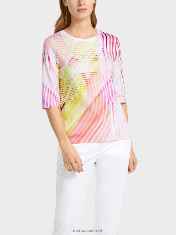 חולצת טריקו צבעונית מכותנה נמתחת עם צלעות. חולצת הטריקו הזו מרשימה עם דפוס הפסים העליז שלה. הוא מחבק דמות ויש לו צוואר צוואר. השרוולים באורך חצי נותנים לו את התוספת הנוספת.