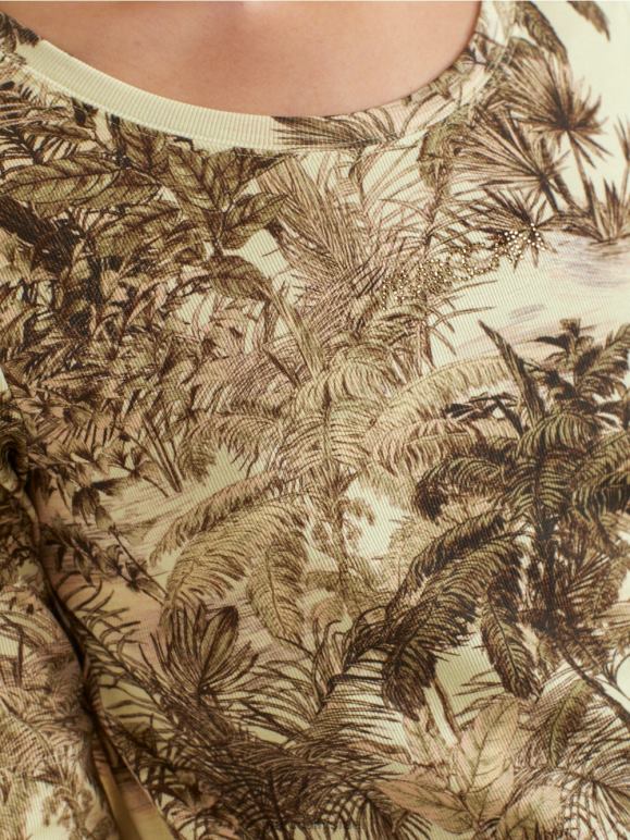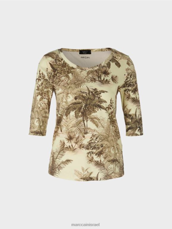 חולצת טריקו מודפסת בעיצוב מצולע משובח. העיצוב הנקי מבטיח שההדפס הפרחוני על-גבי הכול באמת בא לידי ביטוי. כיתוב מארק קין במרכז הקדמי כולל אבני חן עם יישום. הטי-שירט בגזרה מחבקת דמות ובעלת שרוולים באורך שלושת רבעי.