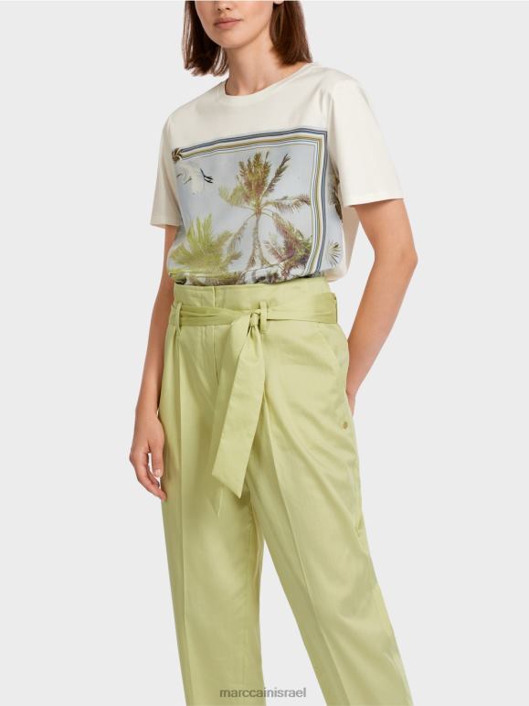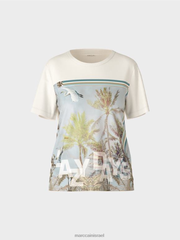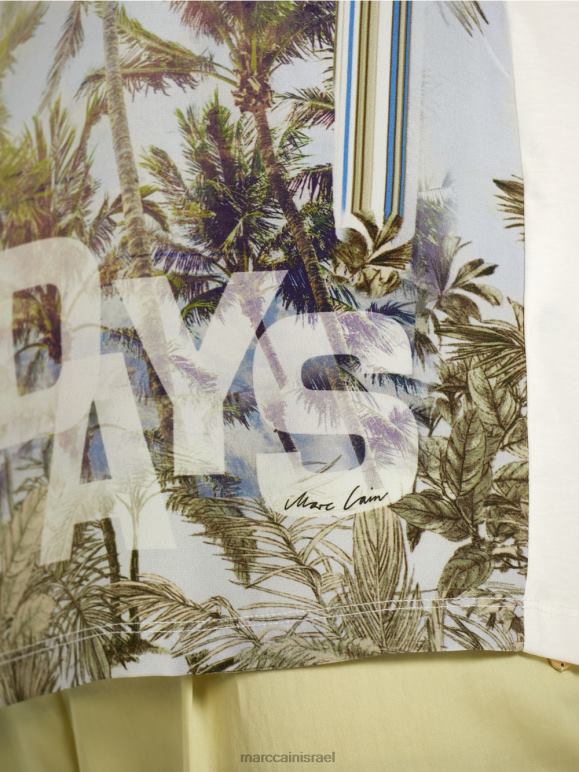 חולצת הטריקו עשויה ג'רסי כותנה משובחת ויש לה תוספת משי בחזית. התוספת מודפסת עם עצי דקל וציפורים פוטו-ריאליסטיים ונושאת את המילים "ימים עצלים" מאת מארק קין.