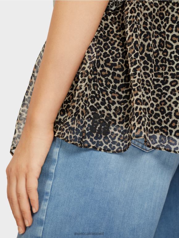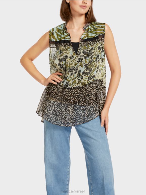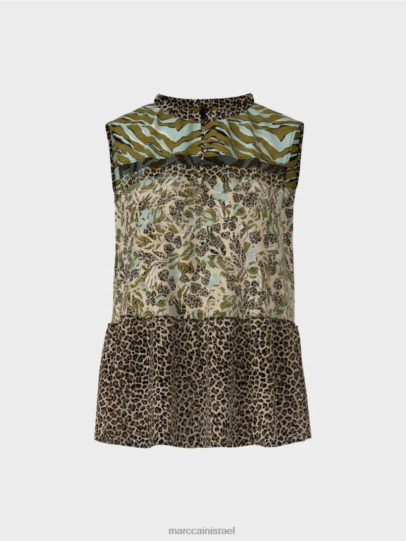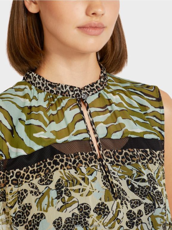 החלק העליון המדורג הזה עשוי מקרפ ויסקוזה משובח. הדפוס הדמיון שואב השראה ממוטיבי החי והצומח. פסי רשת והדפס נמר מוסיפים הדגשים בחזית. הצווארון העמיד אסוף מעט ומהדק עם כפתור ולולאה.