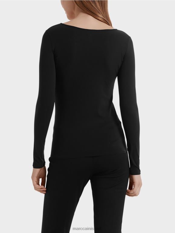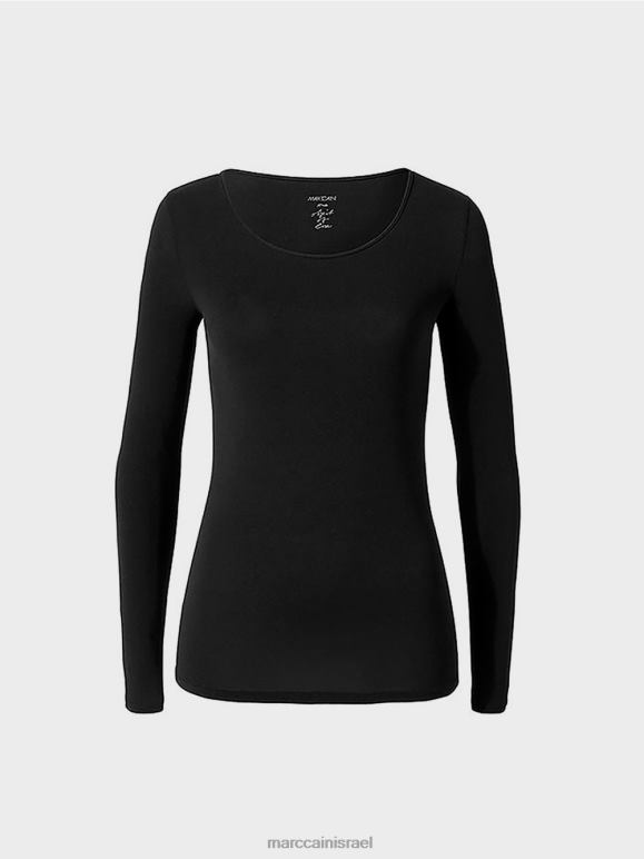 חולצה ארוכת שרוולים צווארון עגול באיכות גבוהה בתערובת חומרים עדינים במיוחד ושקופים בדיסקרטיות של Marc Cain. תפירה כפולה על חפתי השרוולים והמכפלת, בתוספת הדפס לוגו מנצנץ בחלק הפנימי של אזור הצוואר משלימים את העיצוב של הכלי הרך הזה.