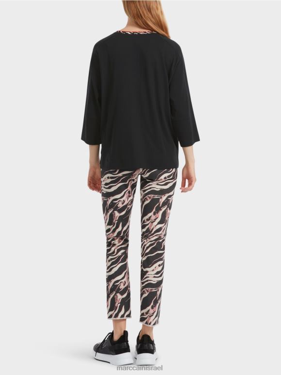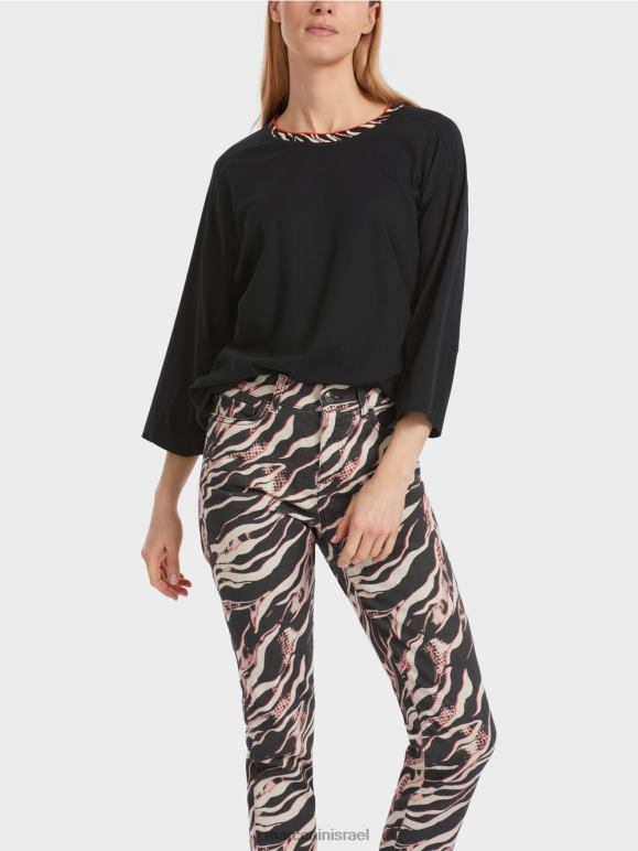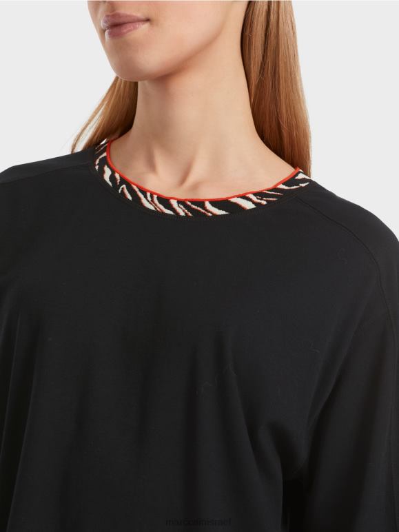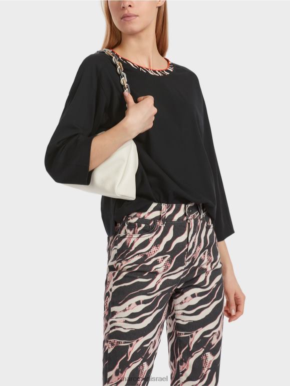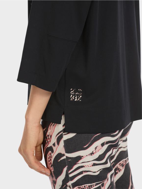 החולצה עשויה מכותנה רכה. בניית השרוול החכמה מאפשרת כתף צרה וגוף רחב נינוח. יש חריצים צדדיים קטנים בשוליים. הגב חתוך מעט יותר. קו הצוואר המושך את העין מוקף בסריג מעוצב.