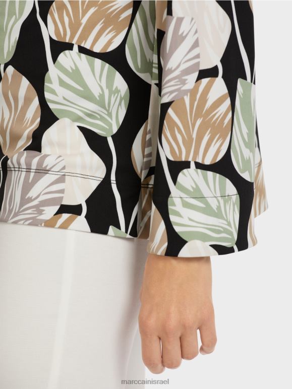 הגזרה הפשוטה מציגה את מוטיב העלים המרשים במלואו. המכפלות הרחבות מדגישות את האיכות הרופפת הקז'ואלית של החולצה העליונה הזו. הגזרה השחורה על קו הצוואר עושה מגע סיום מושך את העין. החריץ מהודק עם לולאה וכפתור.