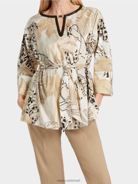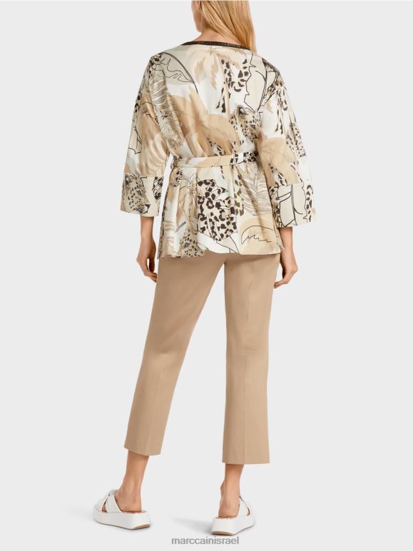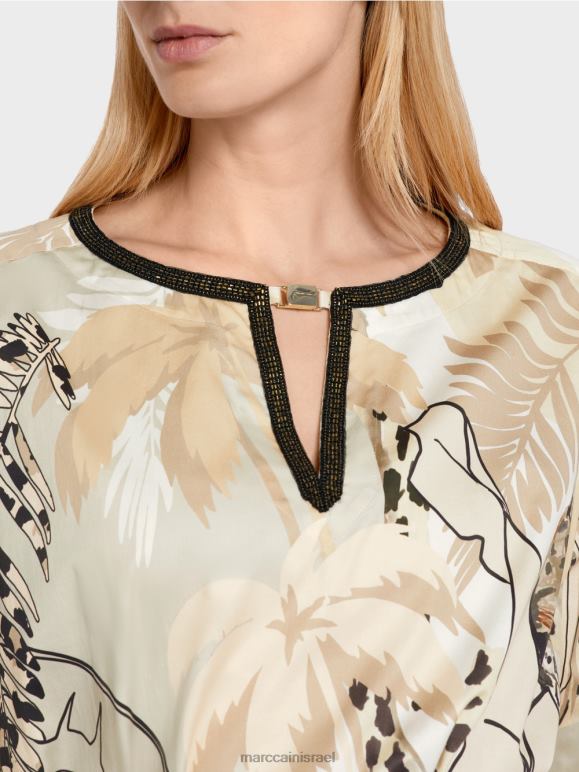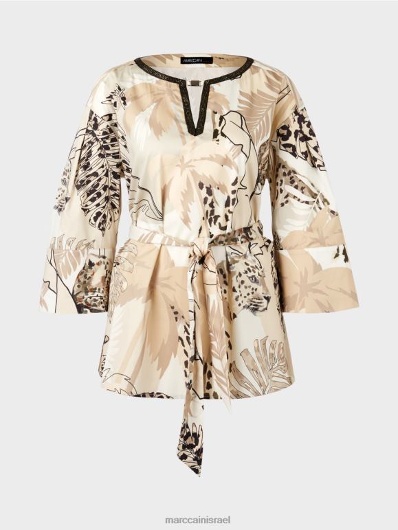 חולצה זו מתהדרת בהדפס דמוי קולאז' עם מוטיבים מבעלי חיים וצומח טרופי. פרטים דקורטיביים כוללים את הגבול רקום החרוזים ואת אבזם המתכת בקו הצוואר. הוא גם מתרחב בסגנון וניתן להפחית את עוצמת הקול בחלק הקדמי עם חגורת עיטוף. מכיוון שניתן למשוך את החגורה דרך חריצים בתפר הצד, הרוחב מאחור נשמר.
