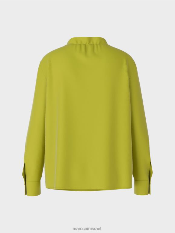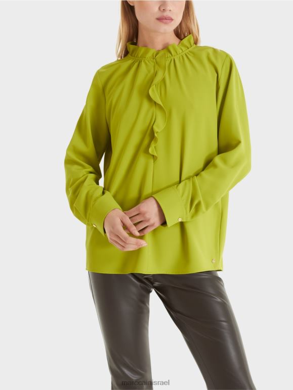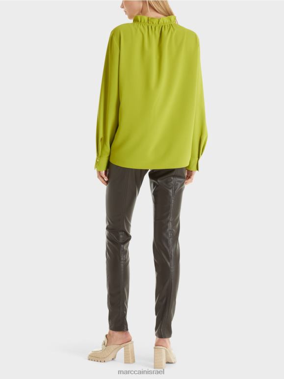 החולצה עשויה מחומר זורם ובעלת צללית מחמיאה לגוף. הדגשים כוללים את הפלאנס בחזית. חפתים רחבים עם כפתור אחד משלימים את המראה. תליון לוגו קטן ממוקם בשוליים.