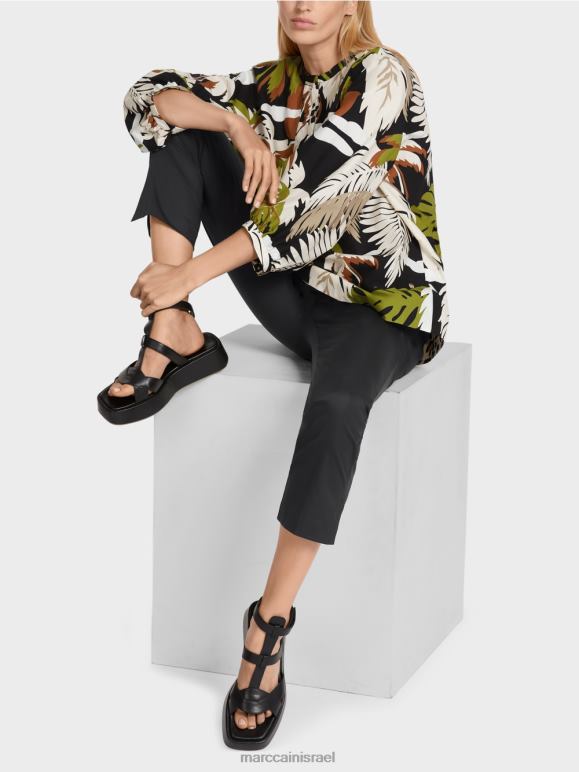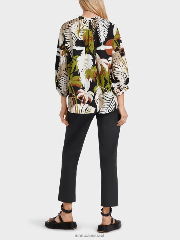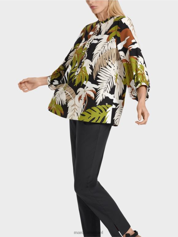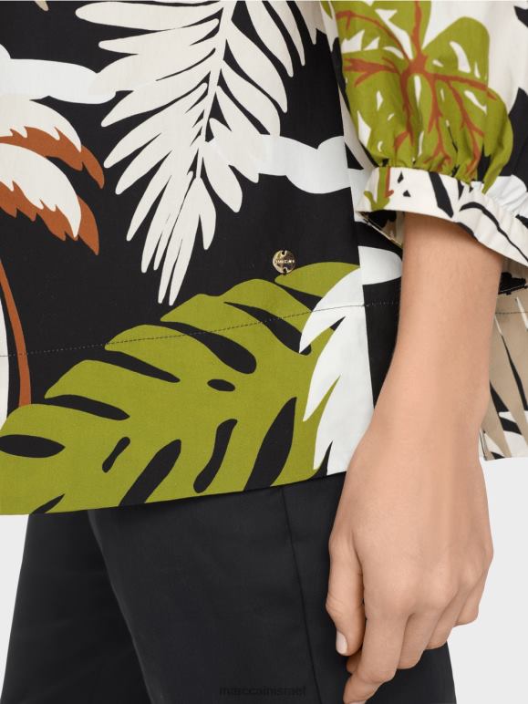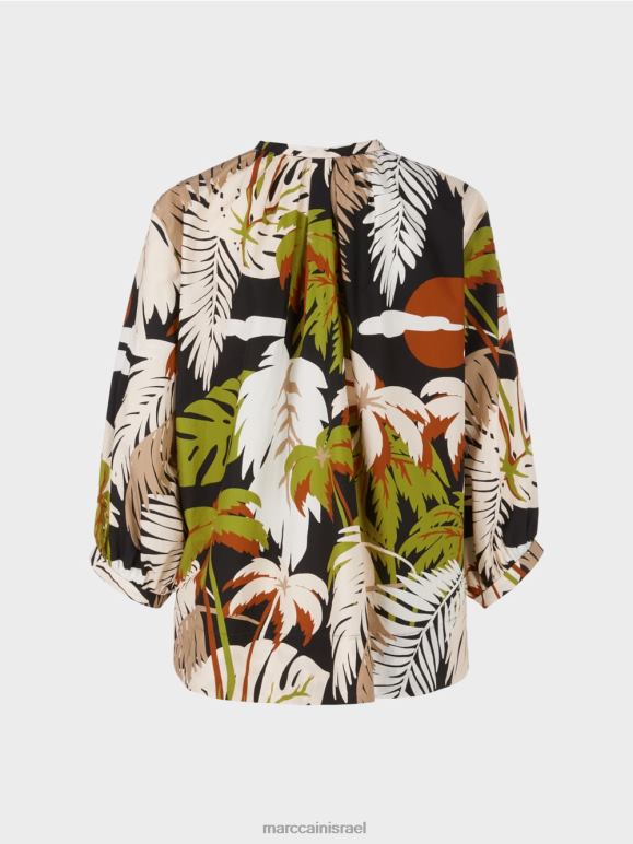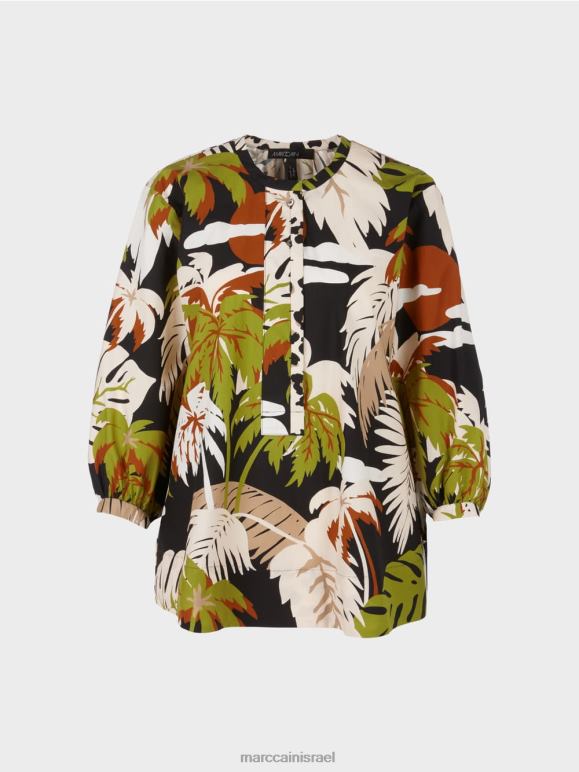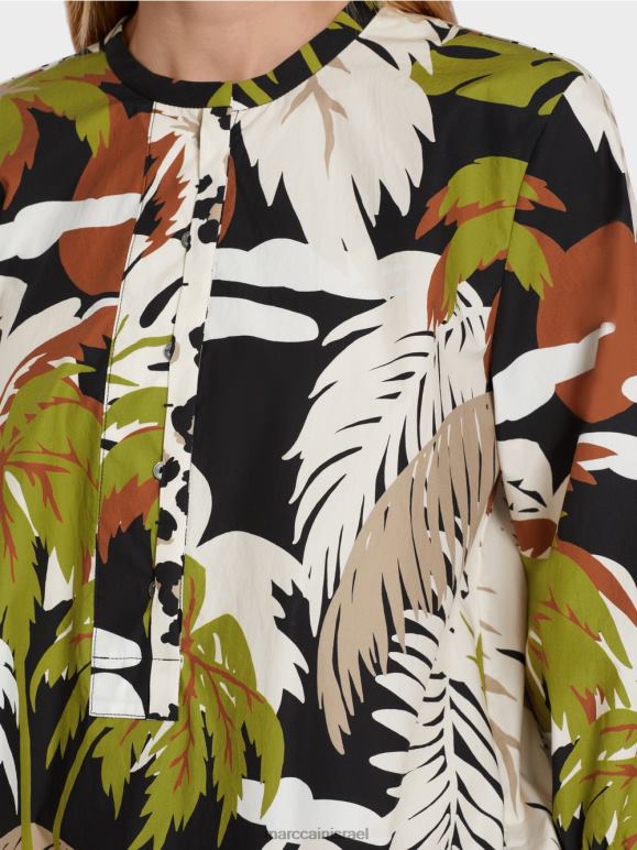 הצבעים וההדפס הטרופי מזכירים את הסגנון של שנות ה-70. חולצת הכותנה הזו חתוכה בנדיבות ומתרחבת מעט. הנפח מאחור מושג על ידי קפלים בקו הצוואר. החולצה מהודקת בחזית עם כיסום כפתורים. שרוול צר אוסף את השרוול ליצירת תכונה בולטת.