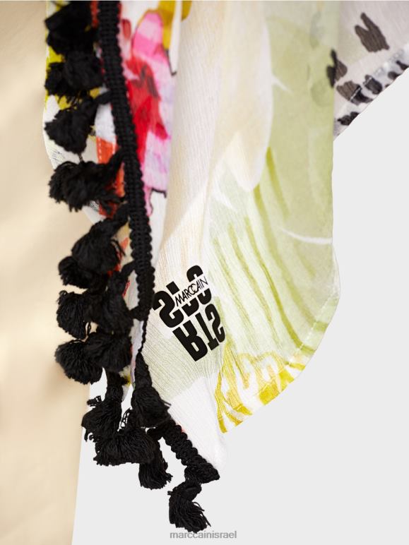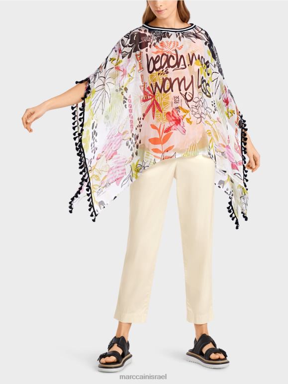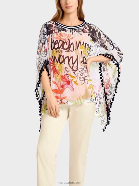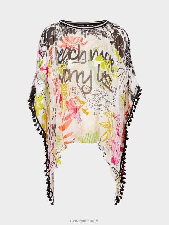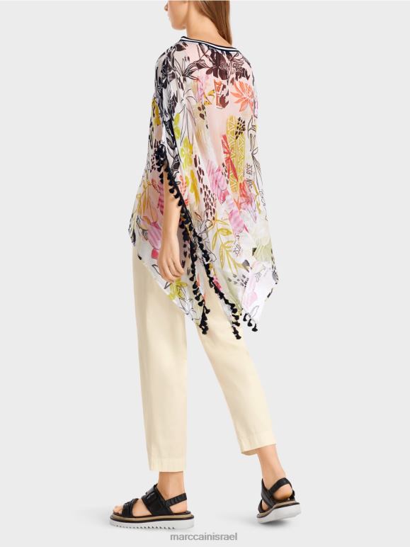 חולצת ויסקוזה בצללית קופסתית. הצורה הקופסתית מדגישה את הסגנון הייחודי של החולצה יוצאת הדופן הזו. הוא מעוטר בלהקת פונפונים בקצוות ומגיע בסגנון פונצ'ו. הוא גם מושך את העין עם דפוס הפרחים הצבעוני שלו. צוואר הסירה סיים עם עיטור מצולע.