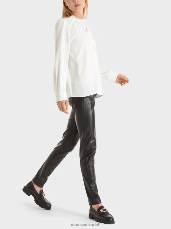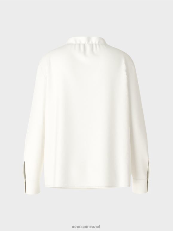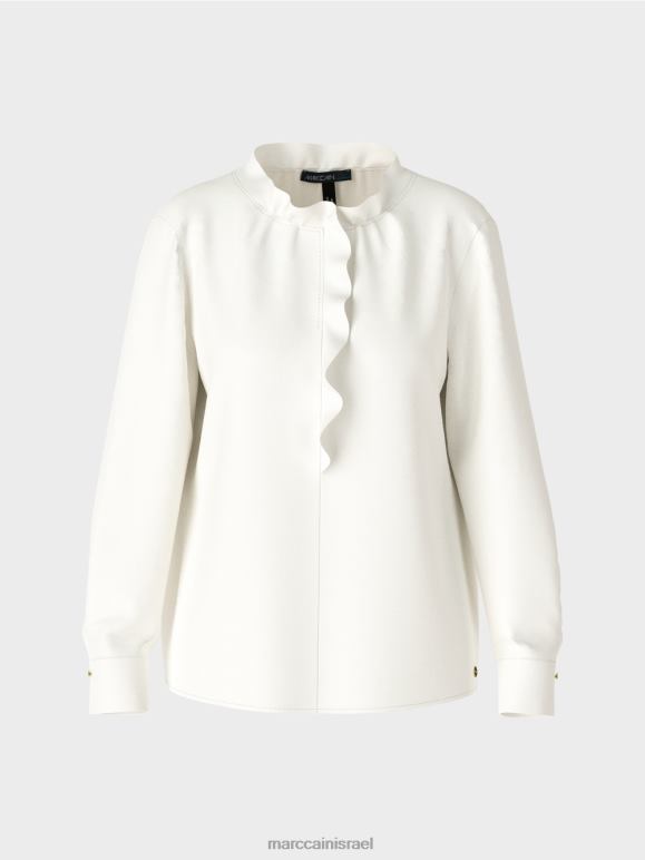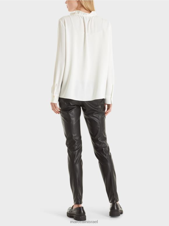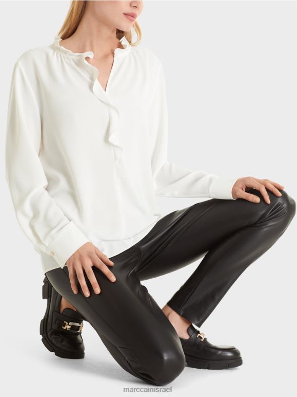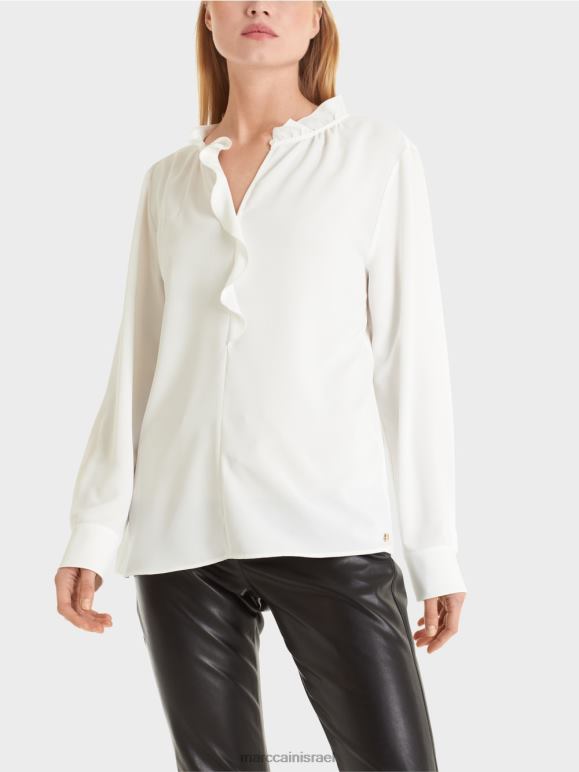 החולצה עשויה מחומר זורם ובעלת צללית מחמיאה לגוף. הדגשים כוללים את הפלאנס בחזית. חפתים רחבים עם כפתור אחד משלימים את המראה. תליון לוגו קטן ממוקם בשוליים.