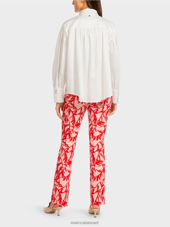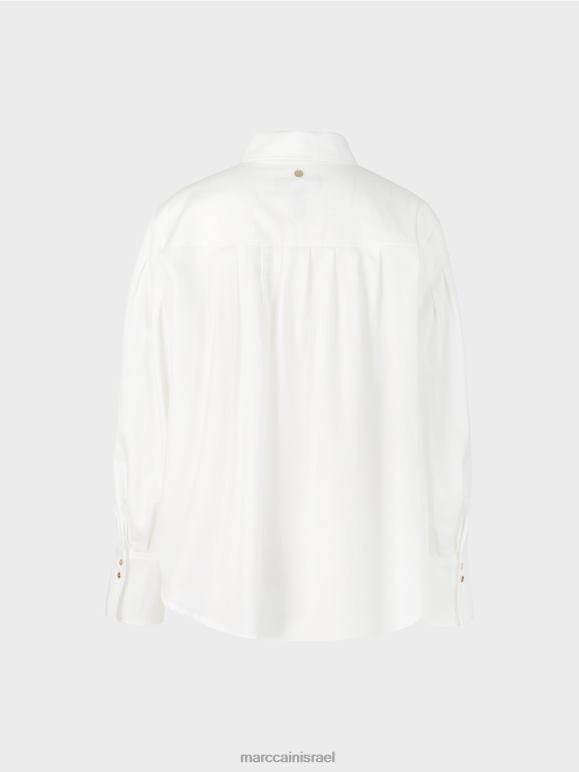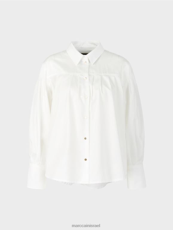 חולצה אלגנטית מכותנה מעט מבריקה עם צללית רפויה. פרטי קפלים בעול הכתפיים ובגב מעניקים לחולצה הזו את מלאות הגומות שלה. יש לו שרוולי בלון ושרוולים רחבים עם חפתים כדי להתאים. כיס הכפתורים באורך מלא כולל כפתורי לוגו מתכת מבריקים. המכפלת מעוגלת ומעט ארוכה יותר מאחור.