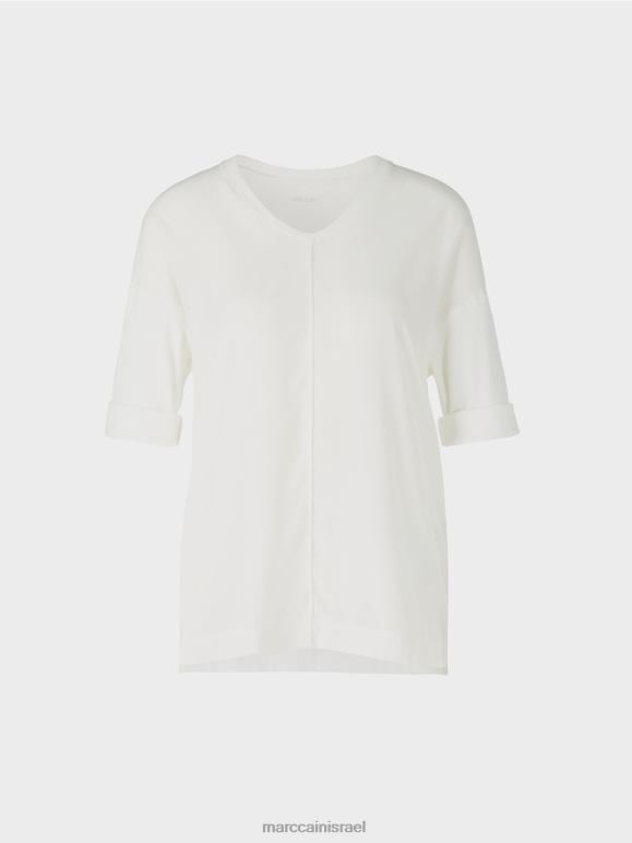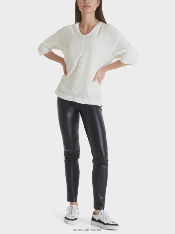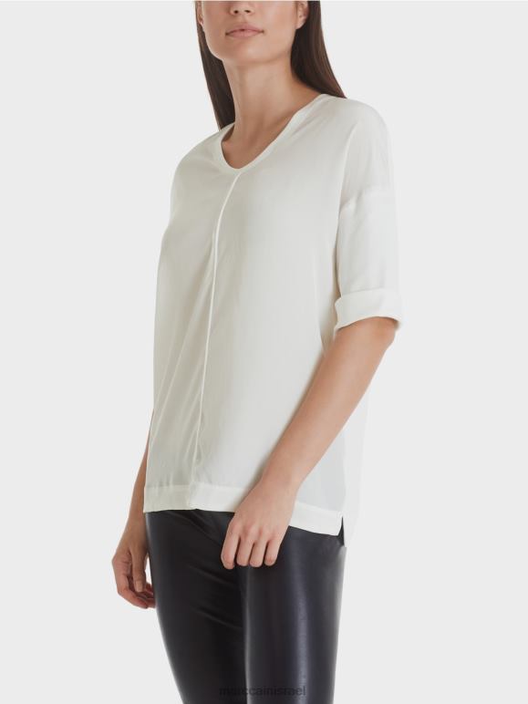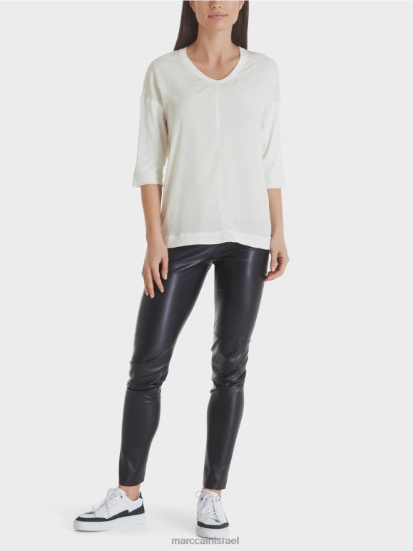 חולצת חולצה מסוגננת עם צללית נינוחה, כתפיים חופפות לא פשוטות ושרוולים בחצי אורך שניתן להפשיל בקלות. חולצת החולצה מציגה את עצמה עם שילוב מרגש של חומרים: הגב והשרוולים המוארכים מעט עשויים מג'רזי מצולע כותנה נוחה, בעוד שהחלק הקדמי עשוי מאיכות מיקרופייבר מנצנץ ברכות.