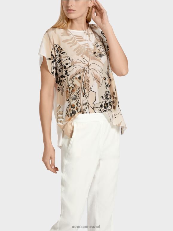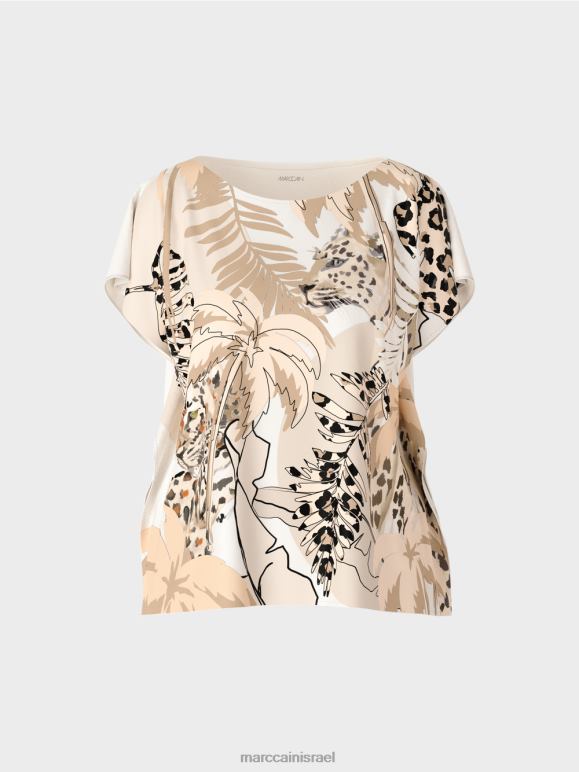 שני חלקים מרובעים על הכתפיים והצד של חולצת המשי הזו תפורים יחד. תפרי הצד מאופקים כ-5 ס"מ פנימה, ויוצרים קצוות רופפים הנופלים בסגנון דמוי פלאנצ'. ההדפס כולל קולאז' של מוטיבים של בעלי חיים וצומח טרופיים. הגב בצבע רגיל.