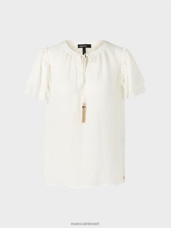 חולצה זו נושאת את תווית הקיימות "לחשוב מחדש ביחד". עשוי בעיקר מפוליאסטר ממוחזר, יש לו אופי קליל ורך מאין כמותו. ניתן להתאים את הרוחב באמצעות איסוף בקו הצוואר. שרוולי הכובע גמורים בפלונים בצורת פעמון. החולצה מהודקת בסרט בעורף. מושך את העין: האלמנט הדקורטיבי דמוי הציצית בקצה הסרטים.
