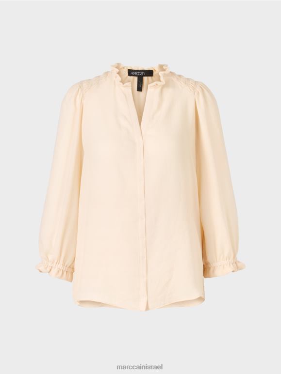 החומר של החולצה יוצר צללית זורמת ברכות. ניתן להתאים את רוחב שרוול הראגלן בכתף עם אפקט סמוקי בולט. צווארון מסולסל מתאים לסגנון זה בצורה מושלמת, בעוד שההידוק המדומה בחזית מוסיף פרט דקורטיבי. חולצה זו נושאת את תווית הקיימות "לחשוב מחדש ביחד".