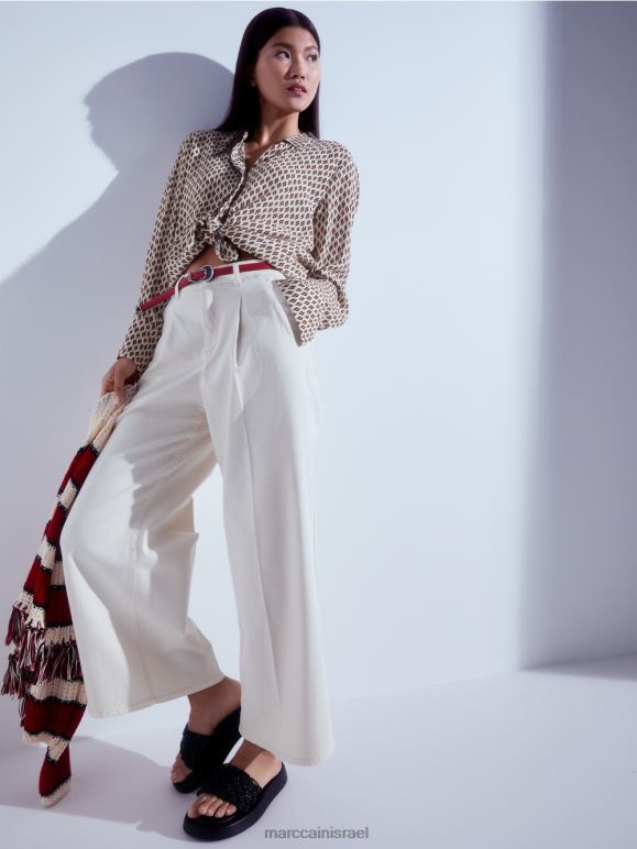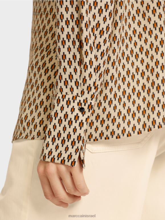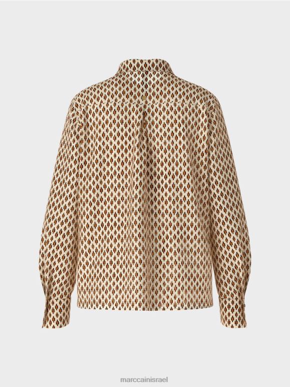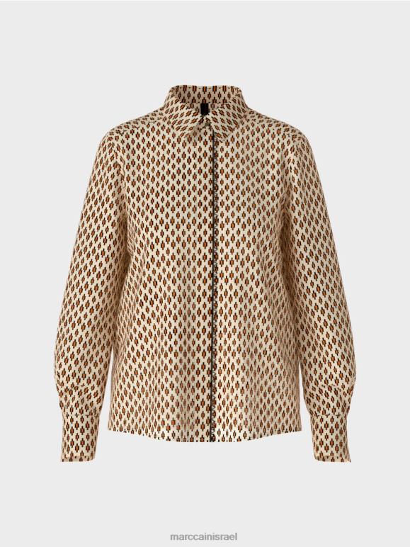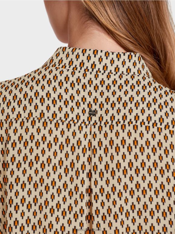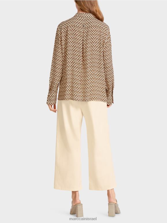 עם כיסום כפתורים סמוי ושרוולים מחושלים, העיצוב הקלאסי הזה הוא חלון הראווה המושלם עבור כולם -על הדפסה. הדוגמה מזכירה את המוטיב של טכניקת צביעת האיקט המסורתית. החולצה עשויה ויסקוזה ליצירת נפילה רכה אך כבדת משקל. עיטור התחרה בכפתור הכפתורים והכפתורים הדקורטיביים בחפתים מוסיפים הדגשים מאופקים.