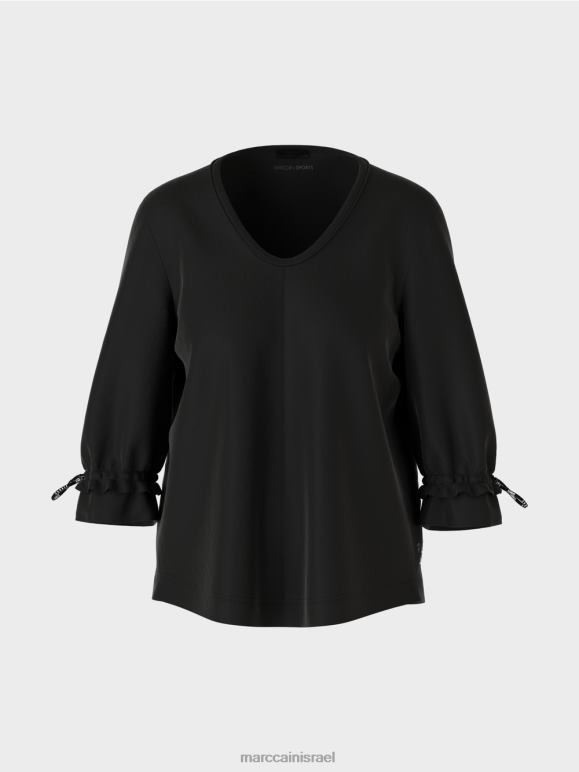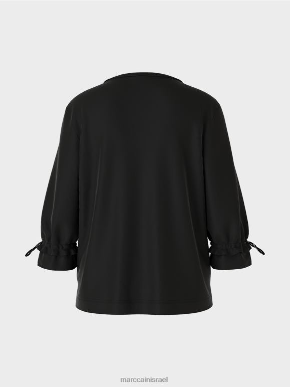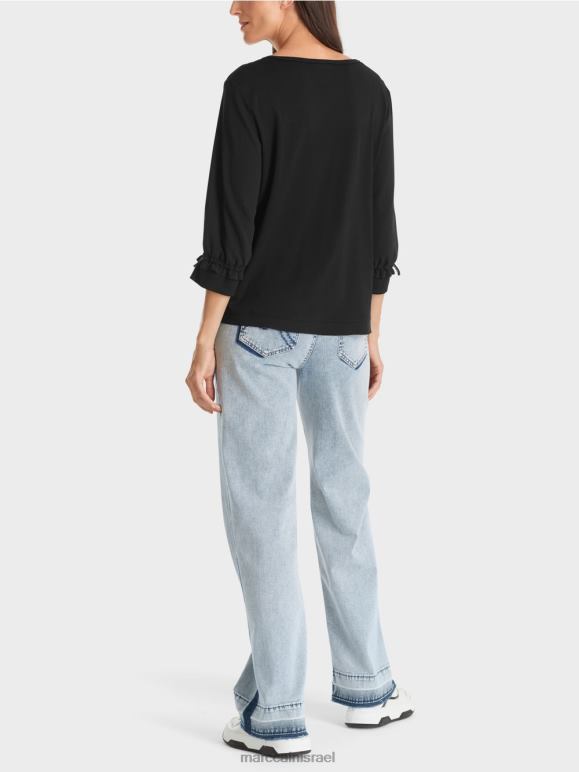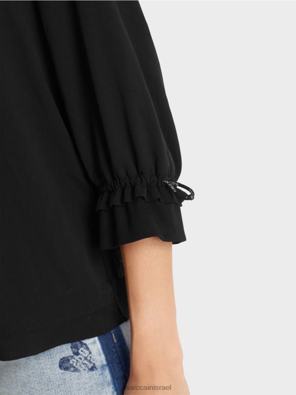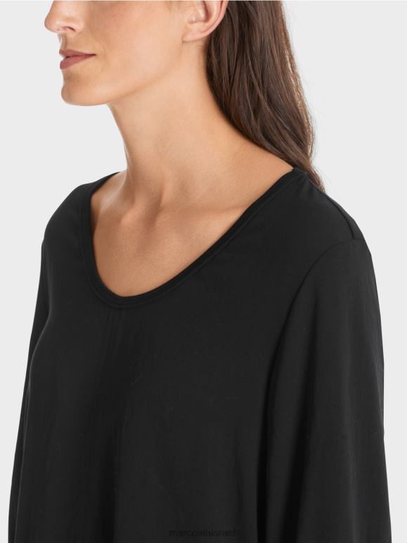 לחולצה יש צללית בצורת A. קו המכפלת מודגש עם עיטור. העיצוב מבוסס על שילוב מלהיב של חומרים: החלק האחורי עשוי מג'רסי מצולע, בעוד שהחלק הקדמי והשרוולים עשויים מבד בעל מרקם עדין. משוכלל, העיבוד של שרוול 3/4, שרוחבו מצטמצם בשולי עם רצועה אלסטית. התוצאה היא גימור מסולסל, אשר מונח בתחתית ג'רסי מצולע - כמו שרוול.