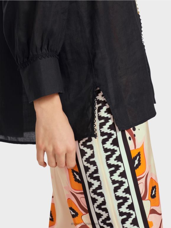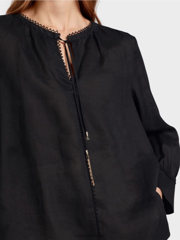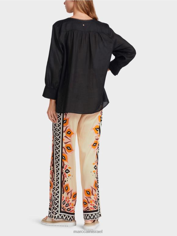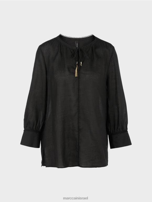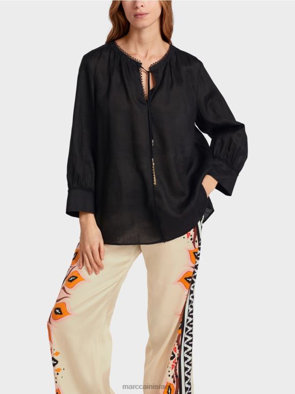 החולצה הזו עשויה מסיני גראס ויש לה תחושה רכה ויבשה למגע. הוא מעט מתרחב. עול הכתף אסוף מאחור נותן לו מעט יותר נפח. השרוך ועיטורי התחרה בטון על הטון על קו הצוואר מעניקים לו מגע אתני. סרטי השרוך מכוסים באלמנטים מתכתיים דקורטיביים: ציצית שרשרת מתכת וראשי תיבות של מארק קין.