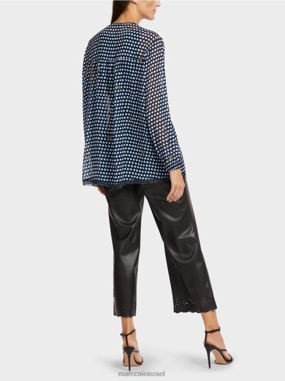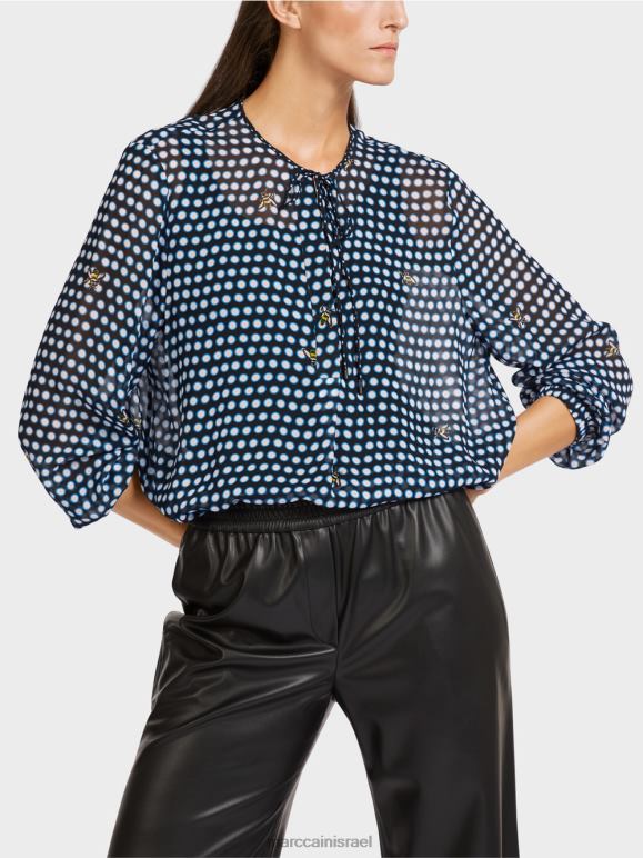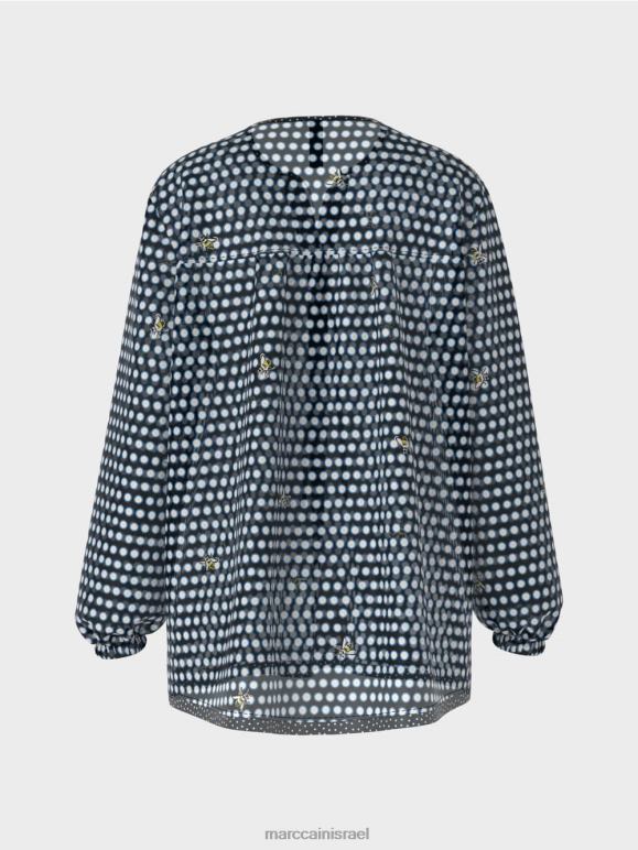 היופי של החולצה טמון בוויסקוזה הזורמת ברכות ובמוטיב הדבורה, המעניק את דפוס נקודות יותר חיוניות. ניגודיות מסופקת עם עיטורים בעיצוב מיני נקודות המעטרות את המכפלת ואת קו הצוואר. החולצה מתרחבת מעט ונמשכת מאחור מתפר העול. כפתור הכפתורים הסמוי קצר וניתן להדק את קו הצוואר בקשירת סרט. השרוולים גמורים עם עיטור אלסטי.