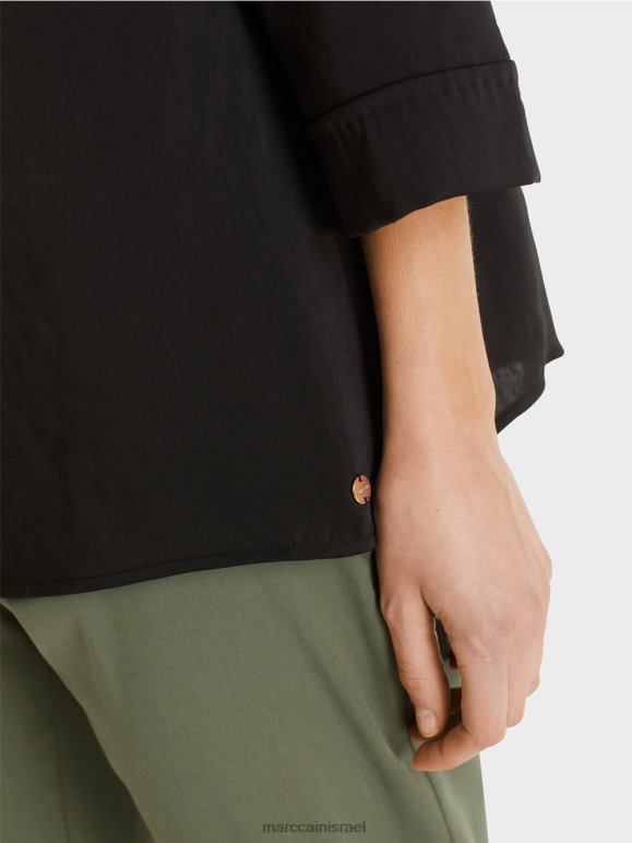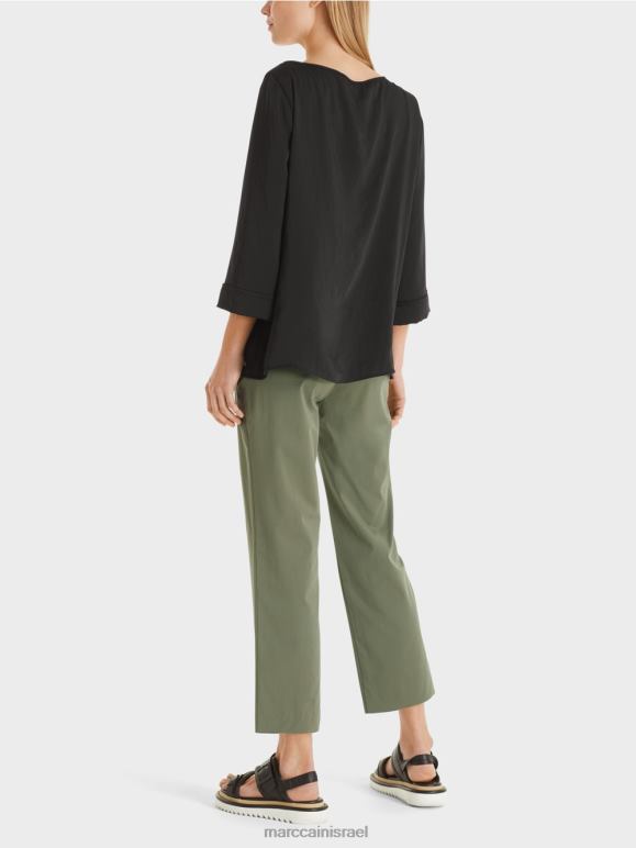 חולצה נינוחה בסגנון חולצה עם שרוולים באורך שלושה רבעים. החולצה הזו מתהדרת בהתאמה נינוחה עם וילון רך. האפקטים התפורים ביד על התפר הדקורטיבי בחזית ועל החפתים מוסיפים פירוט יפהפה. צוואר הסירה חושף בעדינות את המחסנית.