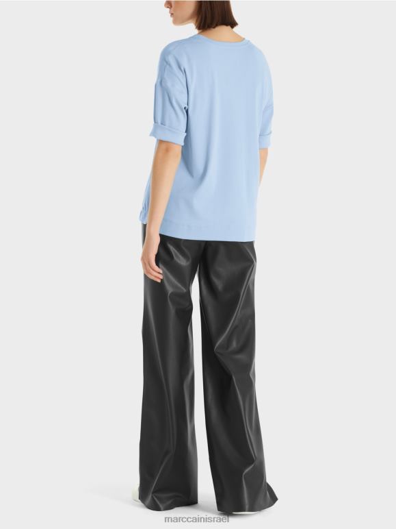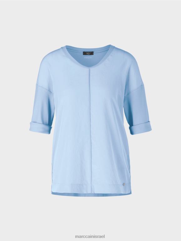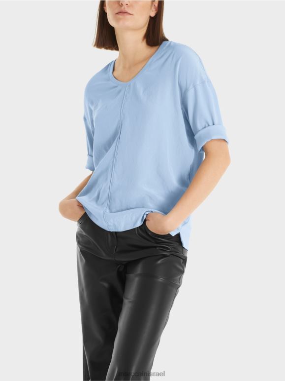 זה שילוב החומרים שנותן לחולצה תחושה של חולצה: הגב והשרוולים עשויים מג'רזי גמיש, בעוד שהחלק הקדמי עשוי מבד רך שזורם. קו הצוואר גזוז בסריג מצולע. צורת החולצה נשית: החל מכתף ושרוול צרים, הגוף מתרחב מעט. המכפלת מודגשת עם חריצים צדדיים קטנים.