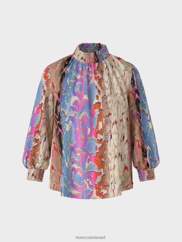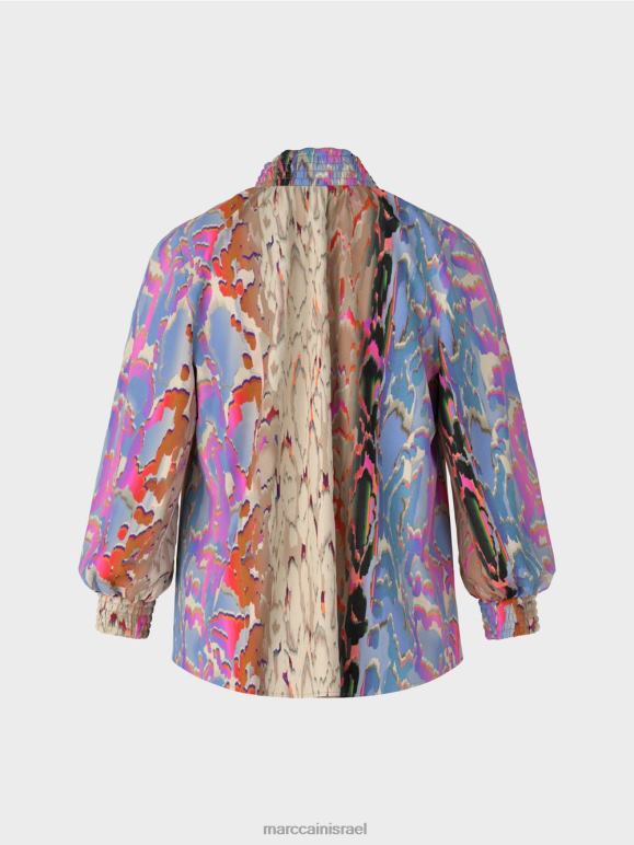 חולצה מודפסת צבעונית זו עשויה מחומר ממוחזר מתווית הקיימות "לחשוב מחדש ביחד". הוא כולל צווארון סטנד-אפ מעוטר וחפתים עם חלוקים. המכפלת מעוגלת מלפנים ומאחור. הצללית מראה את עצמה בצורה רחבה.