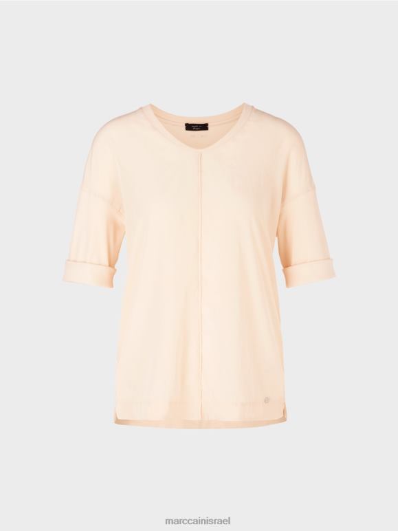 זה שילוב החומרים שנותן לחולצה תחושה של חולצה: הגב והשרוולים עשויים מג'רזי גמיש, בעוד שהחלק הקדמי עשוי מבד רך שזורם. קו הצוואר גזוז בסריג מצולע. צורת החולצה נשית: החל מכתף ושרוול צרים, הגוף מתרחב מעט. המכפלת מודגשת עם חריצים צדדיים קטנים.