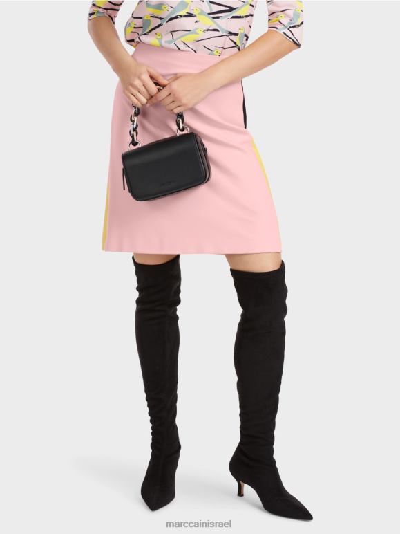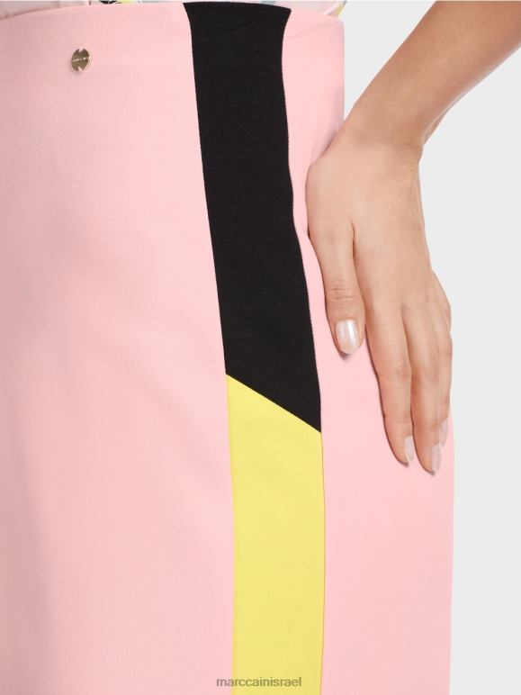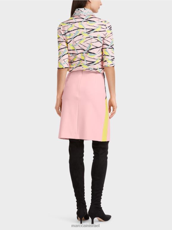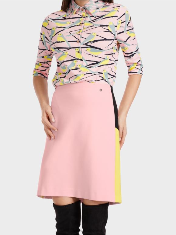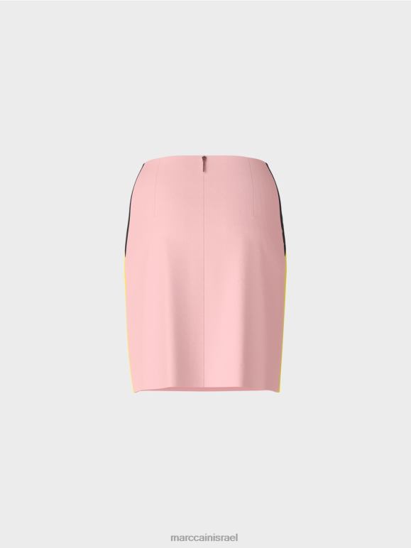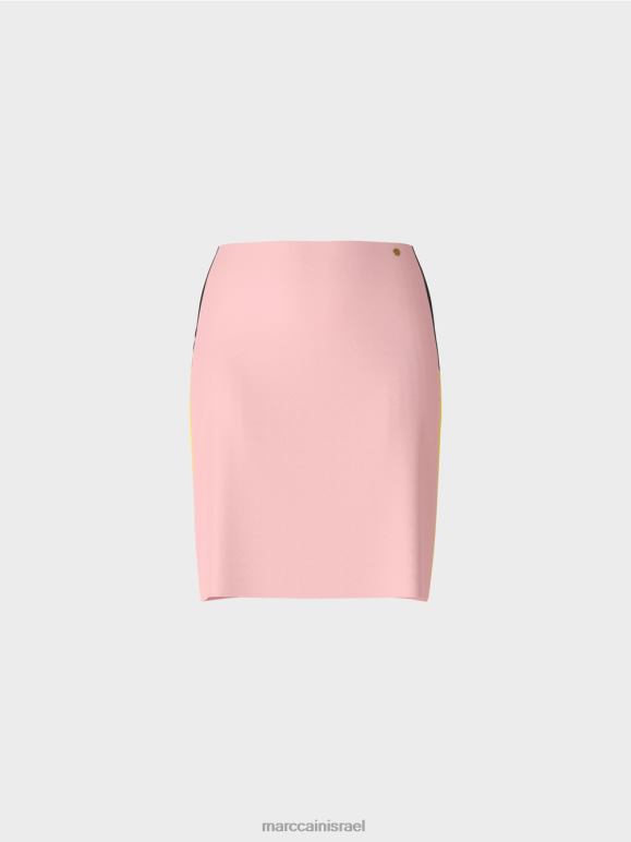 חצאית נופלת ברכות בתערובת חומרים עם ויסקוזה וכותנה. פסי צמה בעיצוב חוסם צבע מעניקים לחצאית המיני הזו את האופי המיוחד שלה. אחרת, הוא מציג צבעים אחידים בצורה מעט מתרחבת. הוא מהודק על ידי כפתור סמוי ורוכסן מאחור.