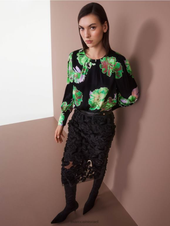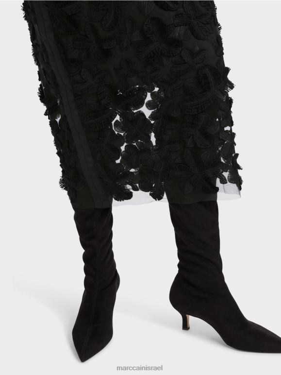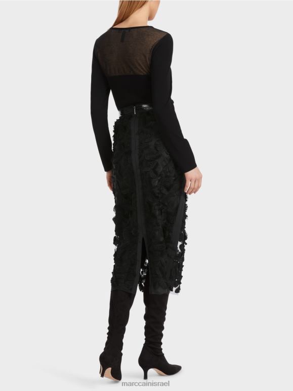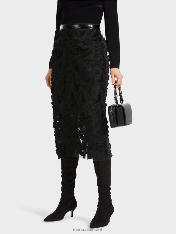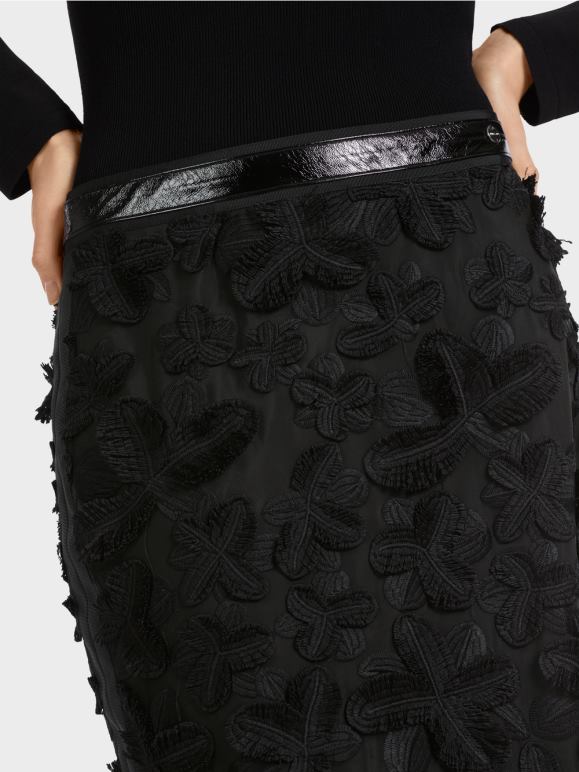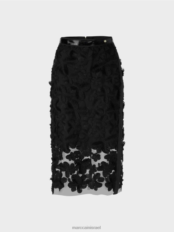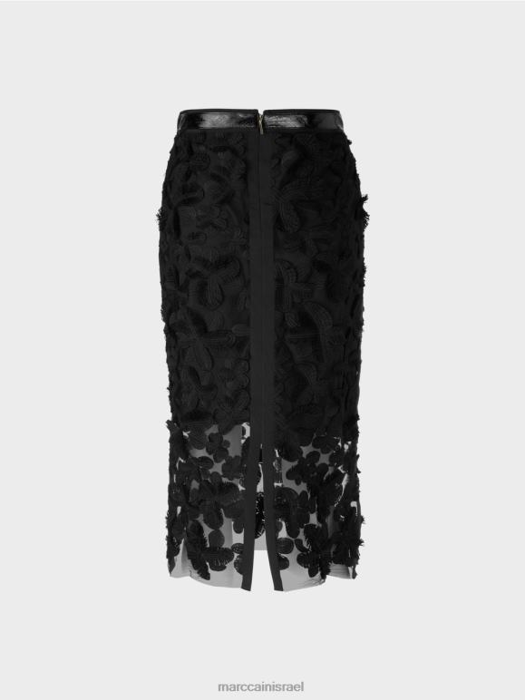 חצאית מידי בגזרה מחבקת דמות עשויה תחרה טול נופלת ברכות. חצאית זו מוצגת בעיצוב פרחוני אלגנטי. החומר השקוף נותן לו את האופי המיוחד שלו. הוא מגיע עם חריץ אחורי ויש לו רוכסן נסתר.