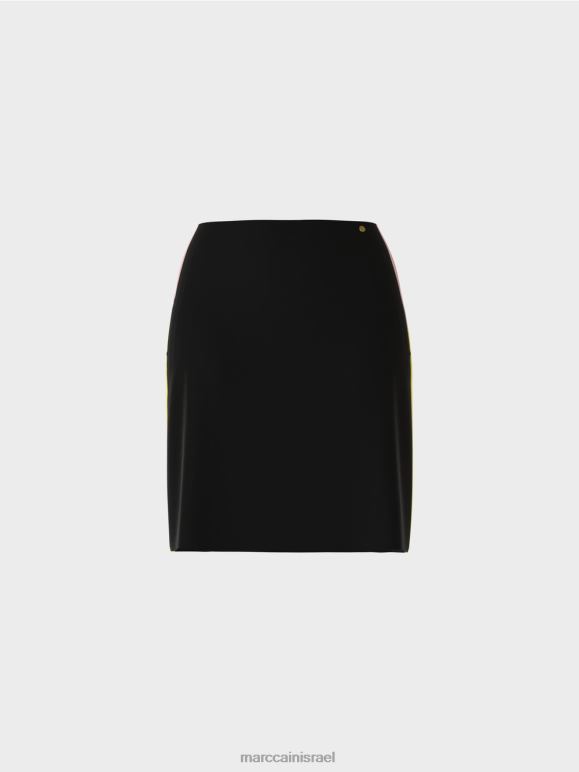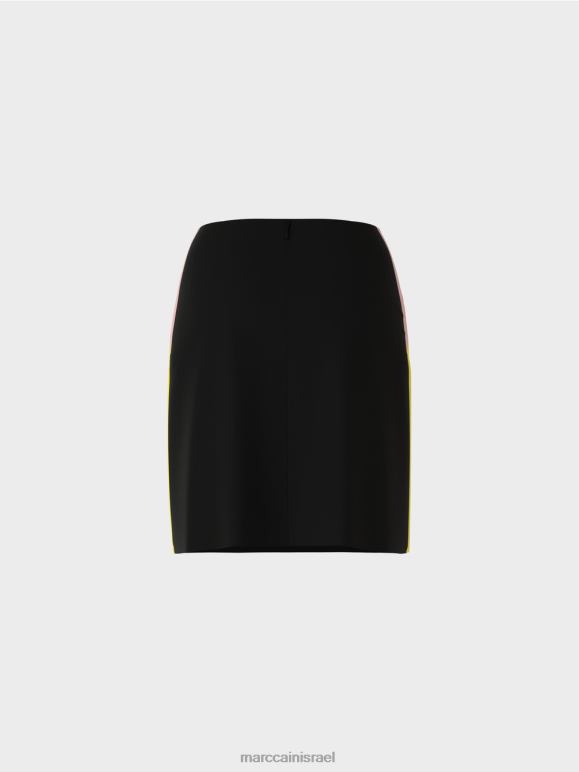 חצאית נופלת ברכות בתערובת חומרים עם ויסקוזה וכותנה. פסי צמה בעיצוב חוסם צבע מעניקים לחצאית המיני הזו את האופי המיוחד שלה. אחרת, הוא מציג צבעים אחידים בצורה מעט מתרחבת. הוא מהודק על ידי כפתור סמוי ורוכסן מאחור.