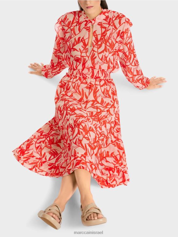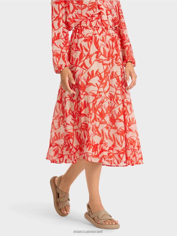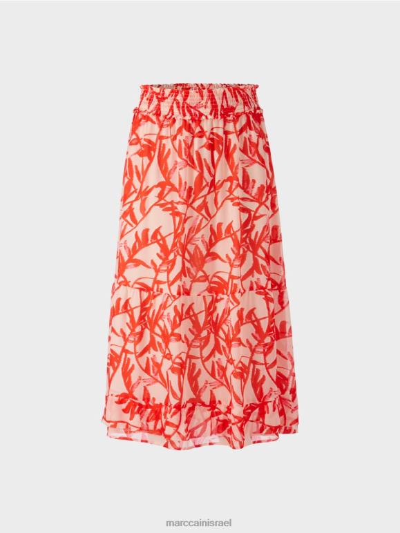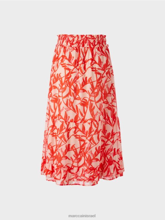 חצאית מחומר עטוף קלות עם צללית רחבה בקו A. חצאית מידי נשית זו כוללת דפוס פרחוני. הפלאנסים המדורגים שלו הם גולת הכותרת של המראה הרומנטי שלו. חגורת המותן הגבוהה משתלבת היטב עם הפרטים המעוטרים המורכבים.