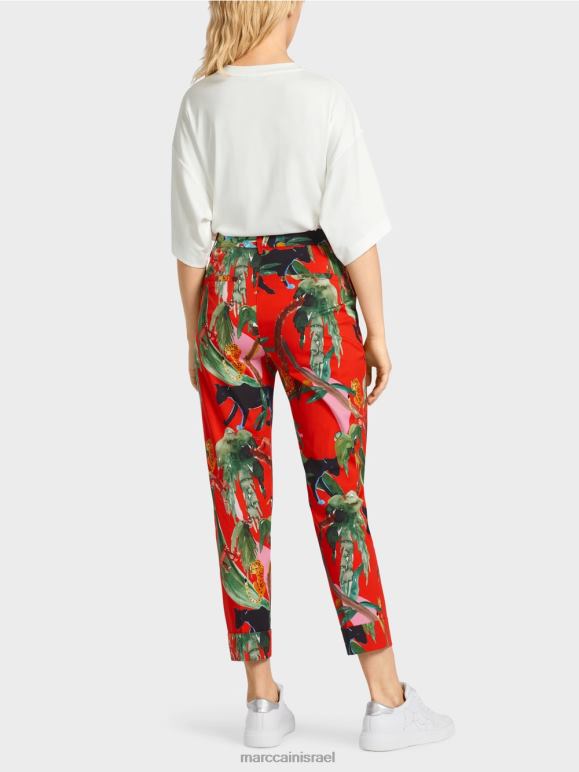 מכנסי פרנקה אלה כוללים עיצוב עם אפקט בצבעי מים המתאר מוטיבים של בעלי חיים וצומח טרופיים. ההתאמה מוגדרת על ידי המותניים הצרות, חופש התנועה בירכיים והרגל המחודדת. בסגנון קלאסי ברובו, הפריט כולל רצועת מותן, קמטים לחוץ, חפתים וארבעה כיסים.