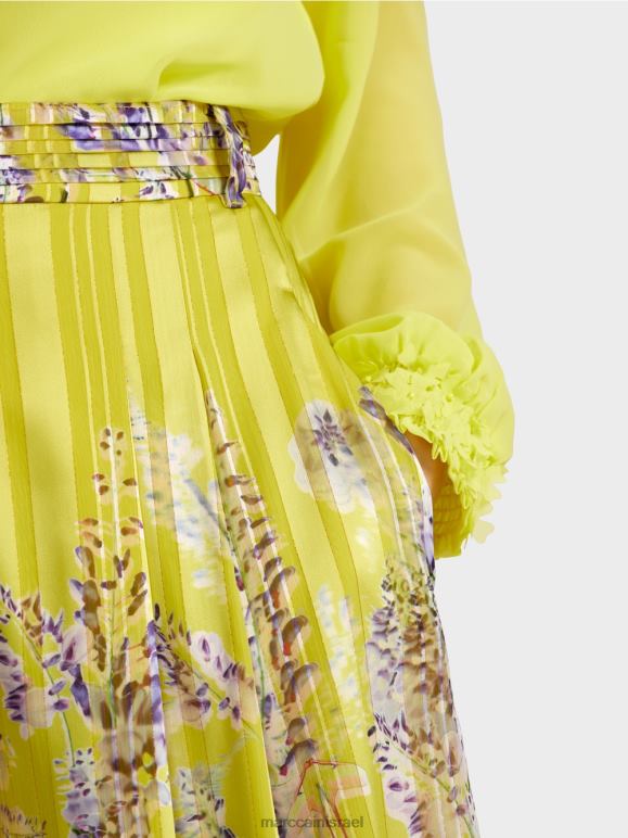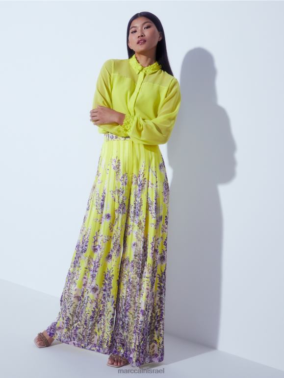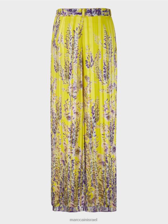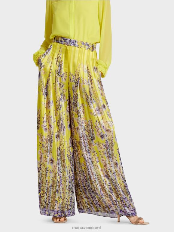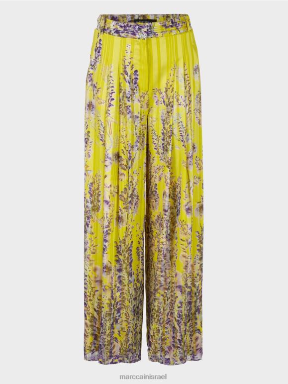 מכנסיים אלגנטיים עם רגל רחבה במיוחד. הרוחב מופיע רק מהמותן ומטה מכיוון שברצועת המותן יש תקעים וקפלי המותניים גמורים בחצים. הפס הארוג בעיצוב יוצר אפקט שקוף ואטום לסירוגין על הדפס ויסטריה שופע. בהיותו עבה יותר לכיוון התחתון, הדפוס מדגיש את רוחב שולי המכנסיים. הפס הארוג מודגש בחוטי נצנצים.
