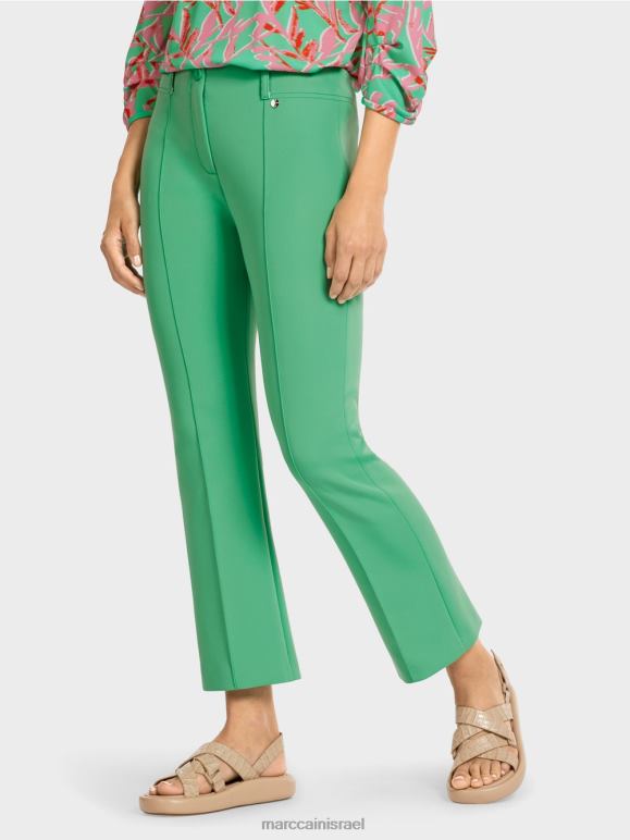 מכנסיים קיציים עשויים מחומר נמתח עם מכפלות מתרחבות מעט. המכנסיים הצבעוניים האלה מעוצבים עם קמטים לחוץ. יש להם התאמה נוחה מאוד הודות לתכולת המתיחה הקטנה ורצועת מותניים אלסטית סמויה. המכפלות המתרחבות מעט יוצרות מראה עכשווי. המכנסיים מהודקים עם זבוב רוכסן וחגורה בהתאם לאופן העיצוב שלהם.