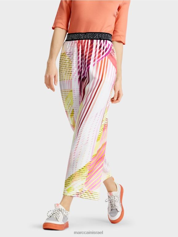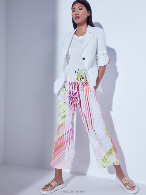 מכנסיים בגזרה יומיומית בחומר רך. המכנסיים האלה מציעים סגנון קיץ רגוע עם הפסים האסימטריים והצבעוניים שלהם. יש להם רגליים רחבות וכיסי צד פרקטיים. רצועת מותן נמתחת בצבעים מנוגדים עם כיתוב Mc Sport מעניק גימור ספורטיבי לעיצוב.