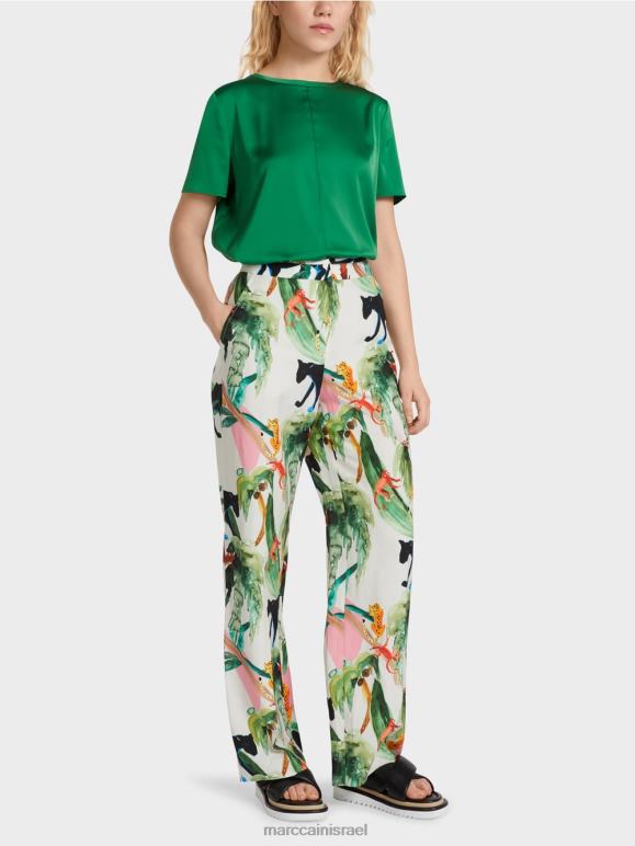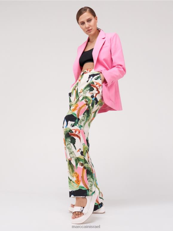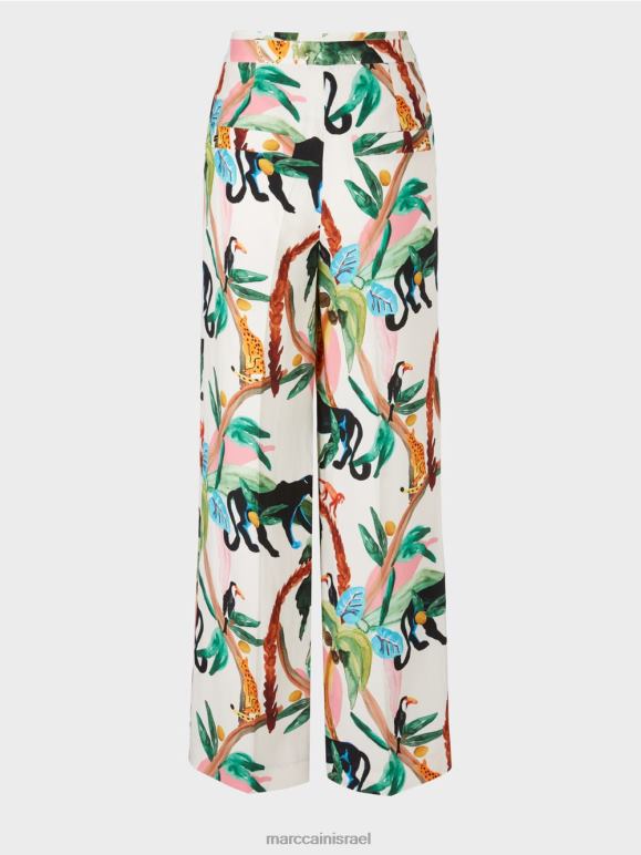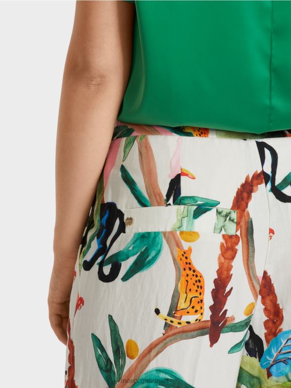 מכנסי Wukari אלה נכנסים גימור קלאסי עם רצועת מותן, רוכסן וארבעה כיסים. הבד עשוי מתערובת פשתן וויסקוזה קלה ורכה. הם מצוידים במותניים ויש להם רגל רחבה וסתמית. מאפיין ייחודי הוא מוטיב החי והצומח הטרופי באפקט של צבעי מים.