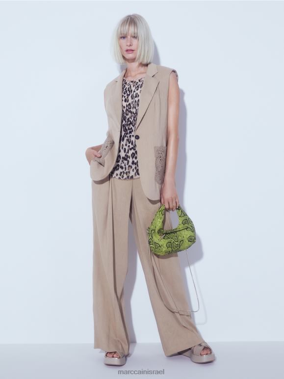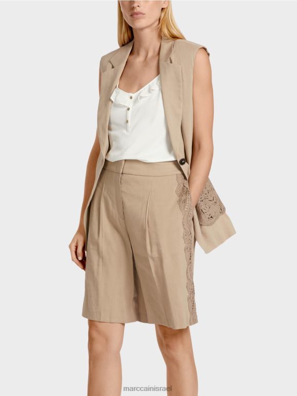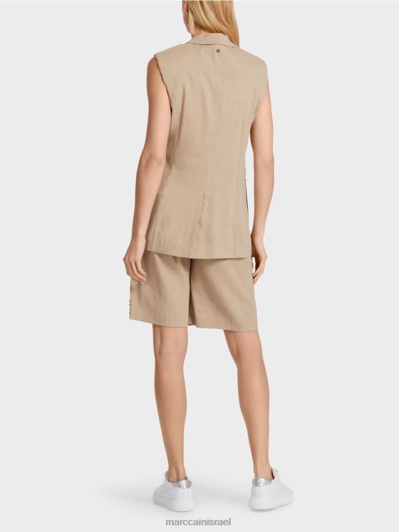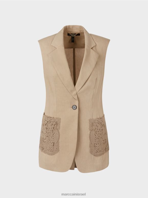 בלייזר פשתן זה ללא שרוולים וללא כיסוי. לכן הוא קל משקל ואידיאלי עבור שכבות קרירות. ההתאמה הנשית מעוצבת עם חצים. הוא כולל כיסי טלאים מושכים את העין מבד תחרה פרחוני. לבלייזר יש פתח אוורור אחורי. הוא נצמד עם כפתור בודד.