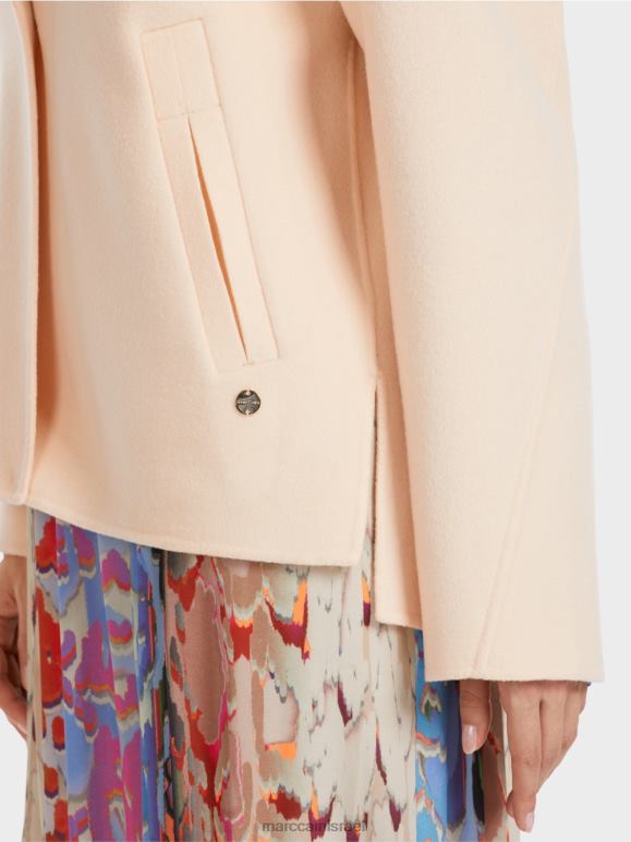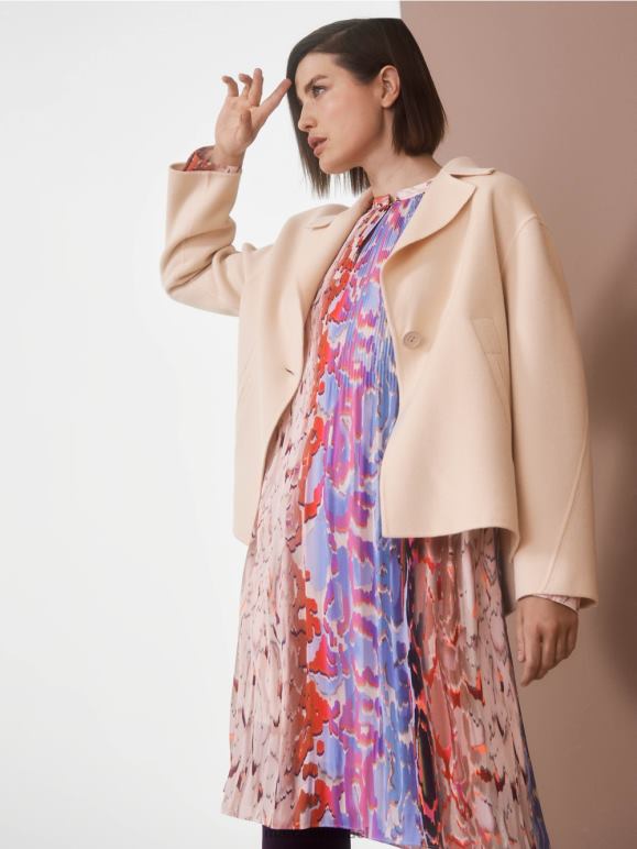מעיל חיצוני אקסטרווגנטי זה עשוי מצמר טהור. הוא מציג את עצמו בגזרה מתרחבת ועם גב מורחב. קפל קופסה מאחור, כמו גם החריצים מדגישים את העיצוב הבלעדי. הידוק הדש והכפתורים הם אלמנטים קלאסיים. את המראה משלימים כיסי צד נוחים.
