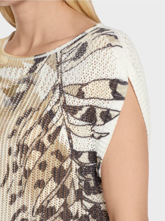 הסוודר הזה ללא שרוולים סרוג בחוט כותנה עם ויסקוזה והוא אוורירי ללבישה הודות לרשת שלו -כמו דפוס סרוג. החזית מודפסת עם מוטיב חי וצומח טרופי דמוי קולאז'. הגב בצבע רגיל. הסוודר מיוצר ב-100% בגרמניה. הוא סרוג וגימור בגרמניה באמצעות הטכנולוגיה העדכנית ביותר והחלקים הבודדים כמו החלק האחורי והקדמי וכו' נתפרים יחד בחברות השותפות האירופיות שלנו.