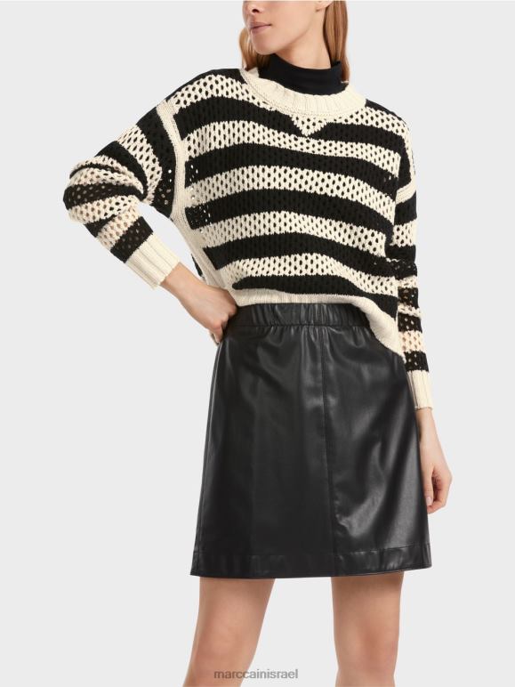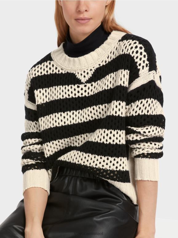 שילוב של סגנונות: הסוודר הזה משלב דוגמה עדינה של Ajour ופס בלוק ספורטיבי. דוגמת התחרה כוללת והופכת אותו לרך וקליל. צורת הסוודר קופסתית והשרוולים ממוקמים נמוך. הפריט נושא את תווית הקיימות "חשבו מחדש ביחד".