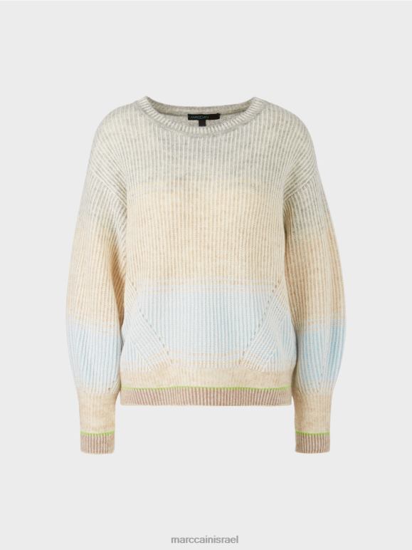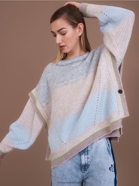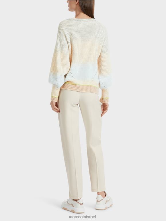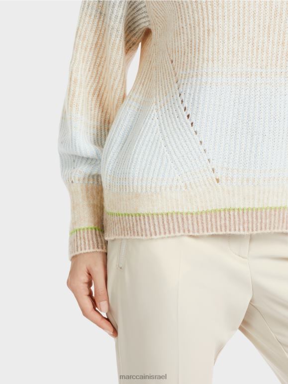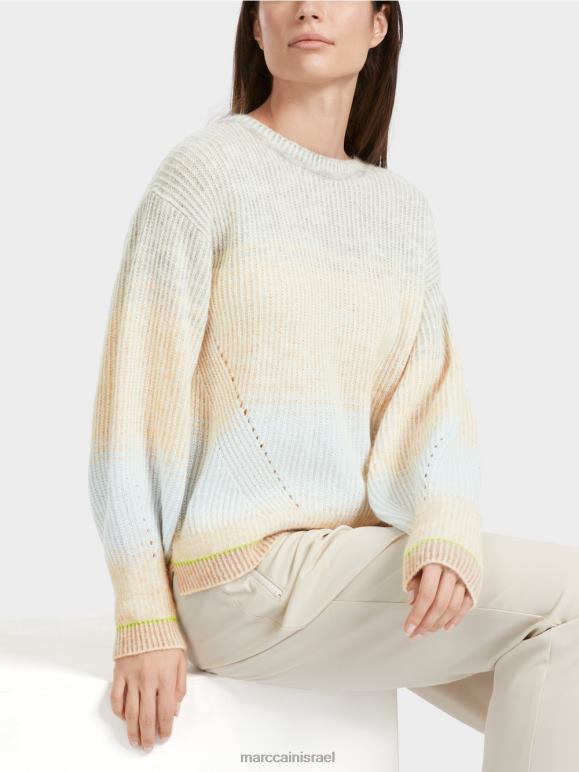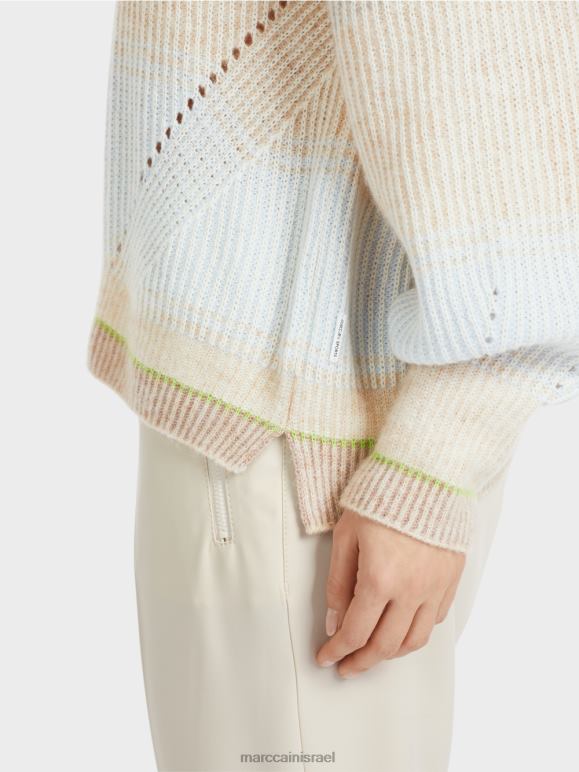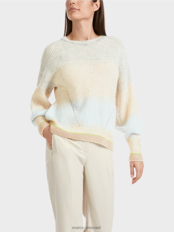 התכונה האופיינית של הסוודר הסרוג היא צורת הביצה. לשרוול יש גם עיצוב בולבוסי מעל השרוול. שיפוע הצבע העדין והשרוול המודגש בצבע פלואור יעילים. האפקט דמוי תגרה נוצר מכיוון שלתפרים הפשוטים וההפוכים יש צבעים שונים.