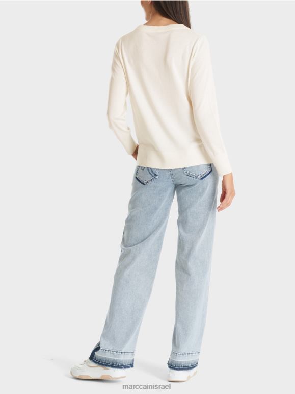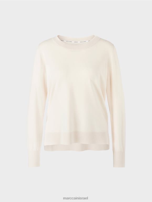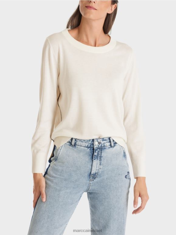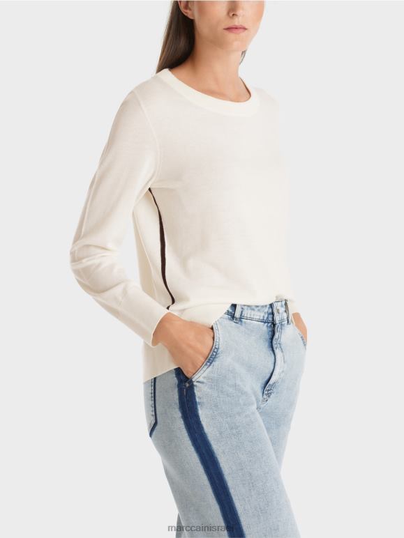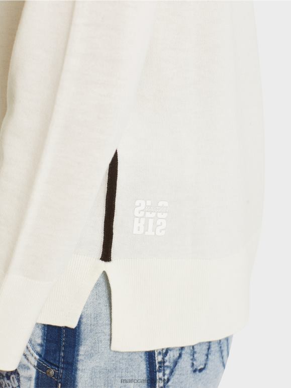 הסוודר הסרוג נושא את תווית הקיימות "לחשוב מחדש ביחד". תערובת החומרים האלגנטית הופכת אותו לקליל ורך. הגזרה היא ברובה קלאסית ומוגדרת באמצעות צוואר עגול וחפתים סריג ושולי. היבטים אופנתיים מופיעים בפס המנוגד בתפרי הצד - ובחרכי הצד.