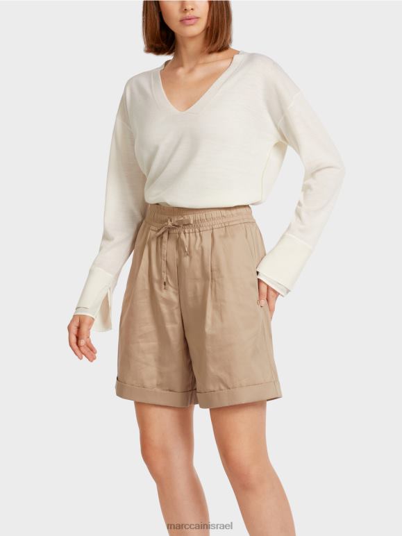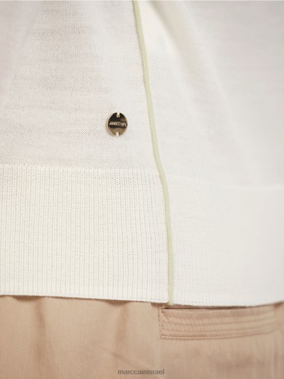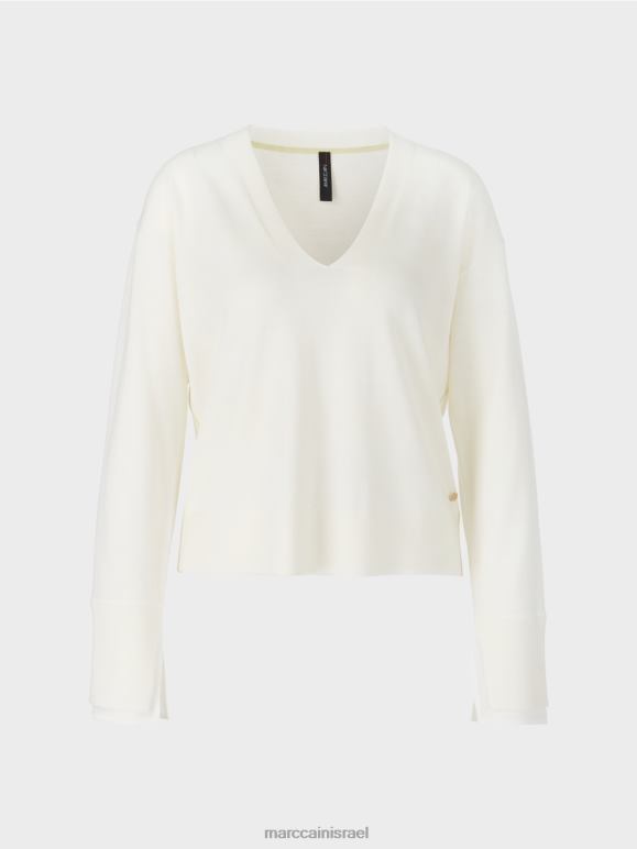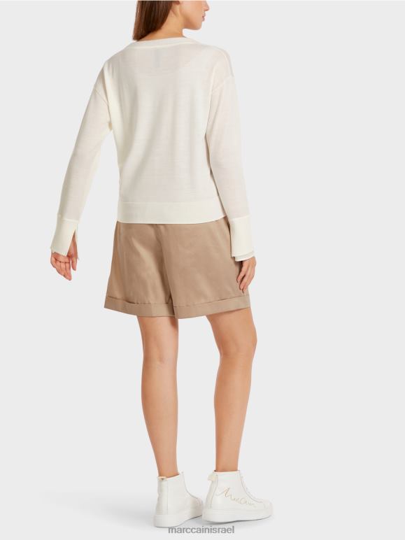 סוודר סרוג משוחרר כלאחר יד בחוט צמר עדין. קו בצבע ניגודי עדין עובר לאורך תפרי הצד. המכפלת פתוחה. שולי השרוול מציגים מראה שכבות מסוגנן. החומר שמציץ החוצה יוצר רושם של חולצה הנלבשת מתחת.