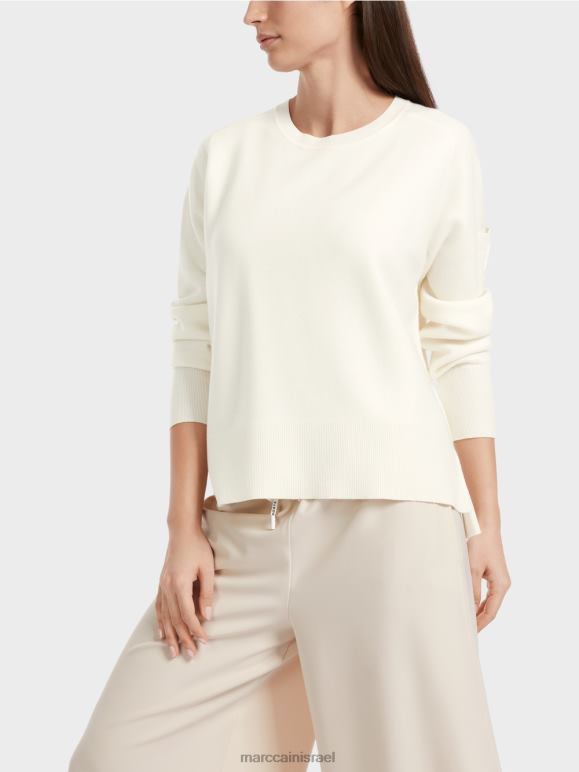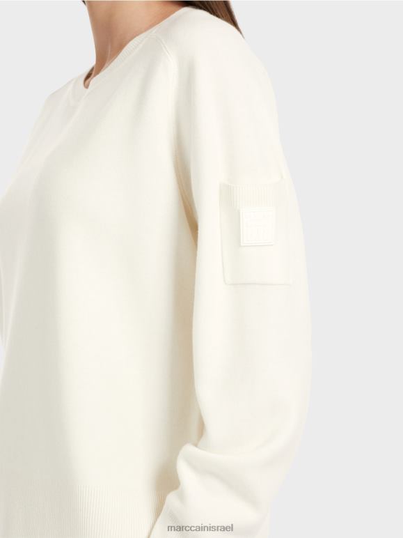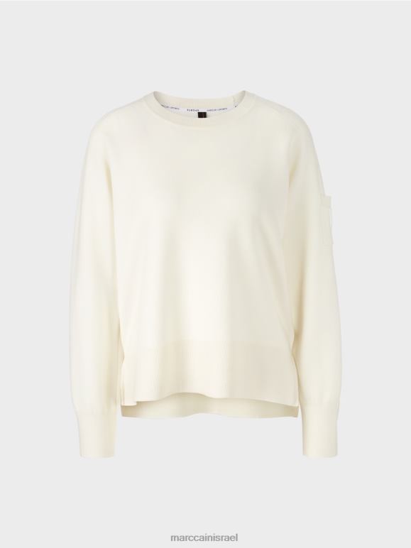 הסוודר סרוג מתערובת חוטים עדינה על בסיס צמר. יש לו שרוול עם כתף אוכף. זה גורם לכתף להיראות צרה יחסית לגוף. פרט מגניב: כיס התיקון על הזרוע העליונה. פרטי ביצוע נוספים כוללים צוואר עגול וחרכים בתפר הצד.