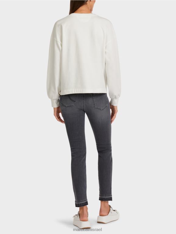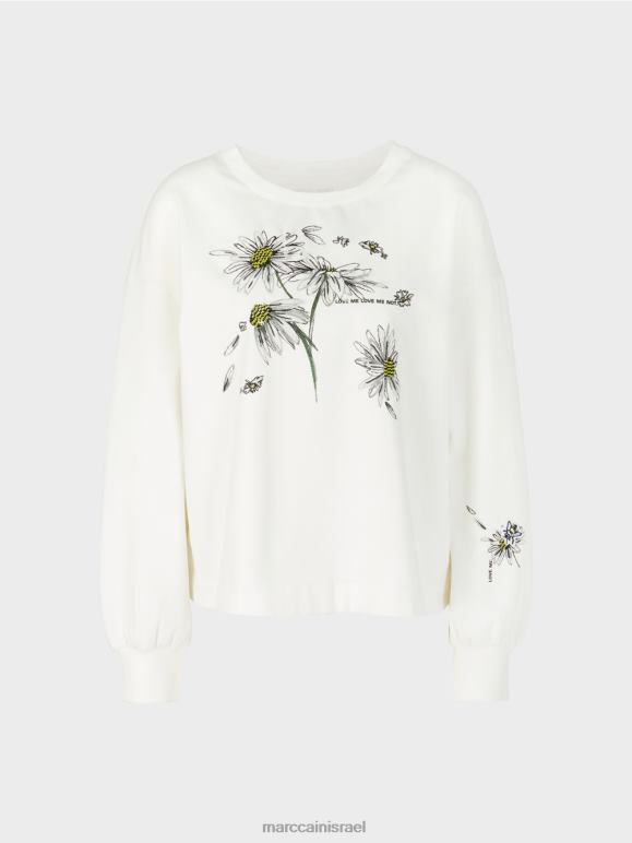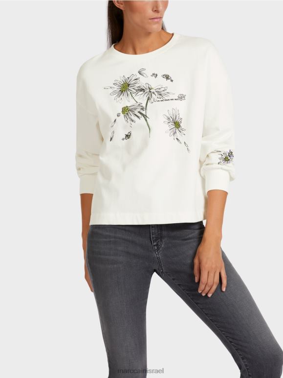 הסווטשירט הגדול הזה מרתק בעיצוב דייזי הדינמי שלו. אפקט זה מתחזק על ידי רקמה ואפליקציות עלי כותרת שקופות. יש דבורה בצד שמאל למטה - גם עם אלמנטים תלת מימדיים. הסווטשירט זורם יפה בזכות תכולת הוויסקוזה הגבוהה ויוצר צללית דמות רפרפת. קו הצוואר והשרוולים בגימור קלאסי עם חפתים. המכפלת פתוחה.