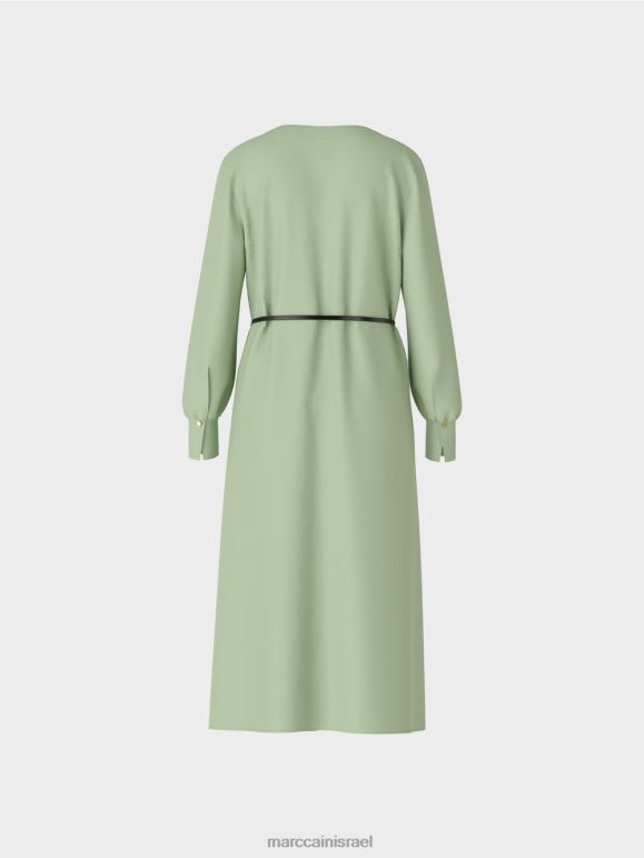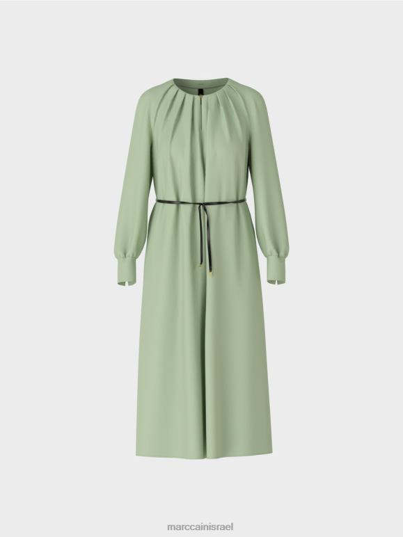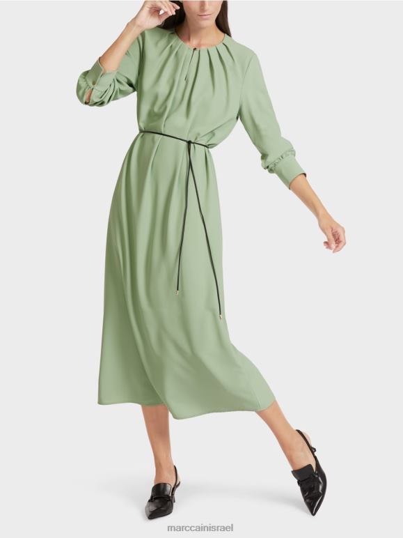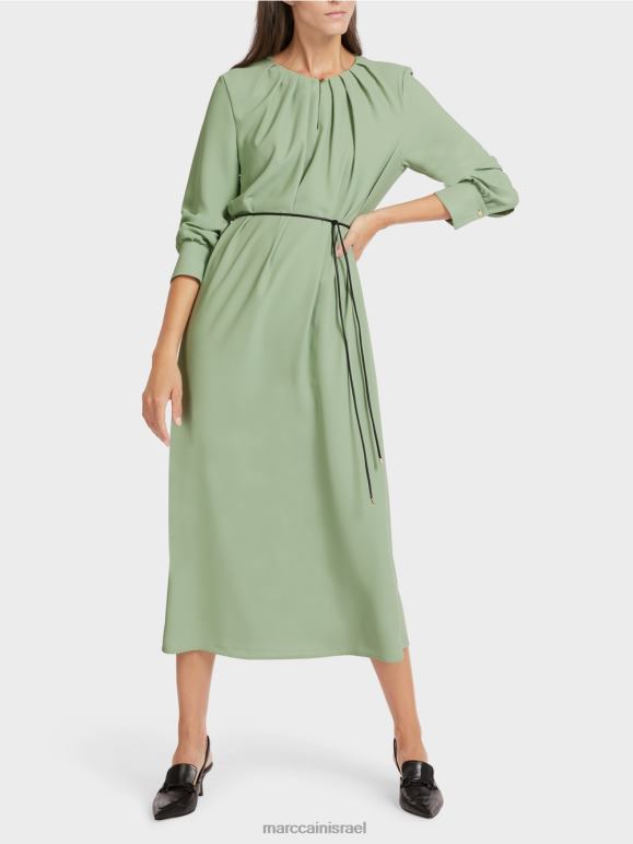שמלה אלגנטית מבד רך. העיצוב של קו הצווארון עם קפל וסגירת כפתורים דקורטיבית הוא גולת הכותרת של היצירה. השרוולים החמושים מתאימים לסגנון החולצה. כפתורים דקורטיביים בחפתים ובקו הצוואר יוצרים תכונה המושכת את העין. ניתן להדגיש את המותניים עם רצועת עור ארוכה.