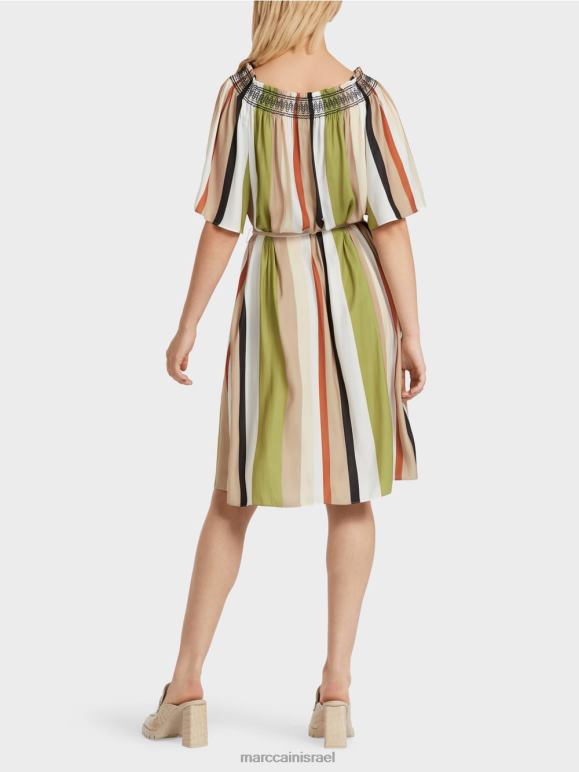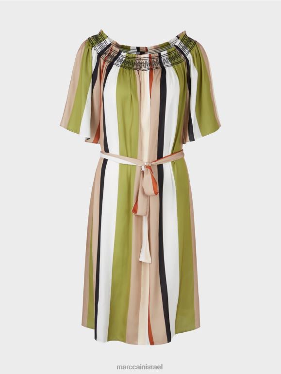 הפסים האנכיים המפוכחים של שמלת הראגלאן הזו משולבים במאפיינים אתניים. לחלוק הגומי יש מראה של גבול רקום ושרוולי העטלף רפויים. השמלה עטופה ברכות וניתן לכרוך אותה במותן עם חגורת מעטפת.